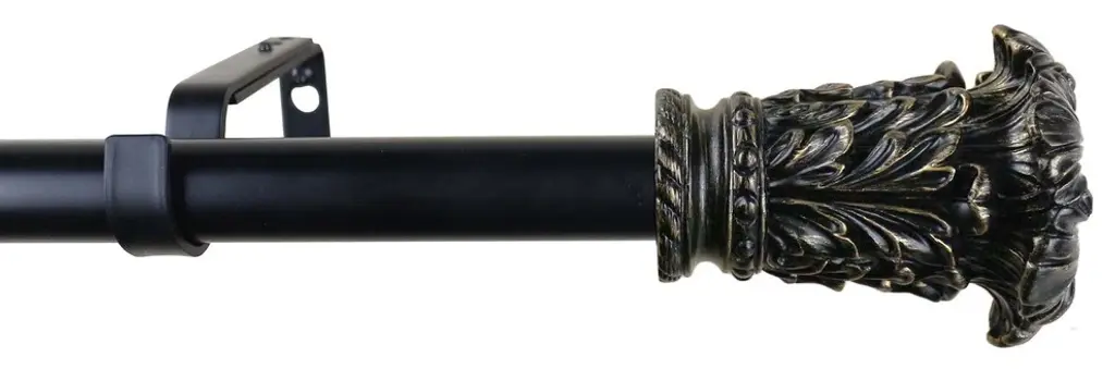 This rod set includes one rod and brackets in a bronze finish, and one set of two finials in a bronze with gold finish.The adjustable curtain rod measures 1" diameter and comes with polyresin finials. The finials measure 3 5/8" long and 2 1/2" in diameter. The rod extends from 48" to 84".Mounting hardware included for easy installation.Adjustable brackets measure 5" to 6 3/4" long, 4 1/2" to center of bracket cup; 1 3/4" wall mount span. 2 brackets included with 28"-48"; 3 brackets included with 48"-84" and 84"-120" lengths.