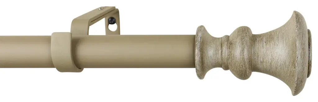 This rod set includes one rod and brackets in a French white finish, and one set of two finials in a gilded French white finish.The adjustable curtain rod measures 1" diameter and comes with polyresin finials. The finials measure 3 3/8" long and 2 7/8" in diameter. The rod extends from 28" to 48".Mounting hardware included for easy installation.Adjustable brackets measure 5" to 6 3/4" long, 4 1/2" to center of bracket cup; 1 3/4" wall mount span. 2 brackets included with 28"-48"; 3 brackets included with 48"-84" and 84"-120" lengths.