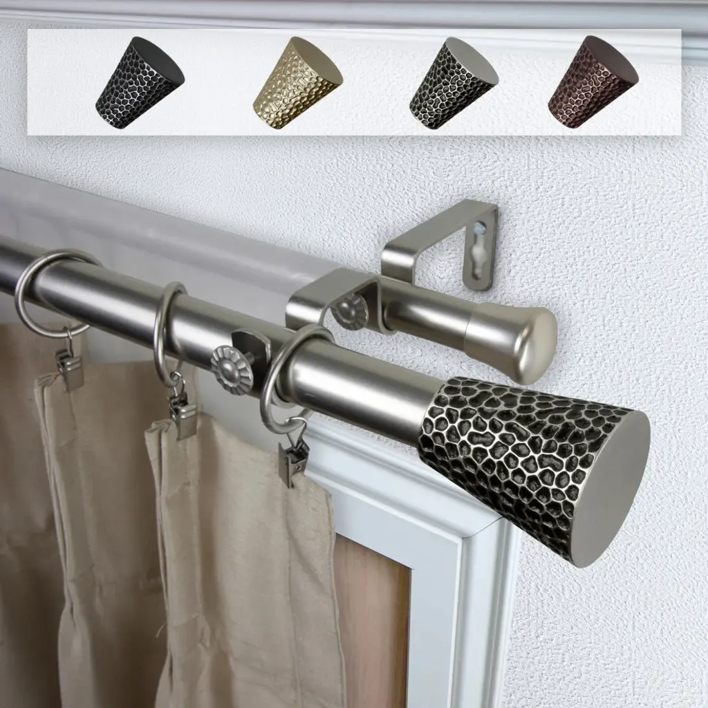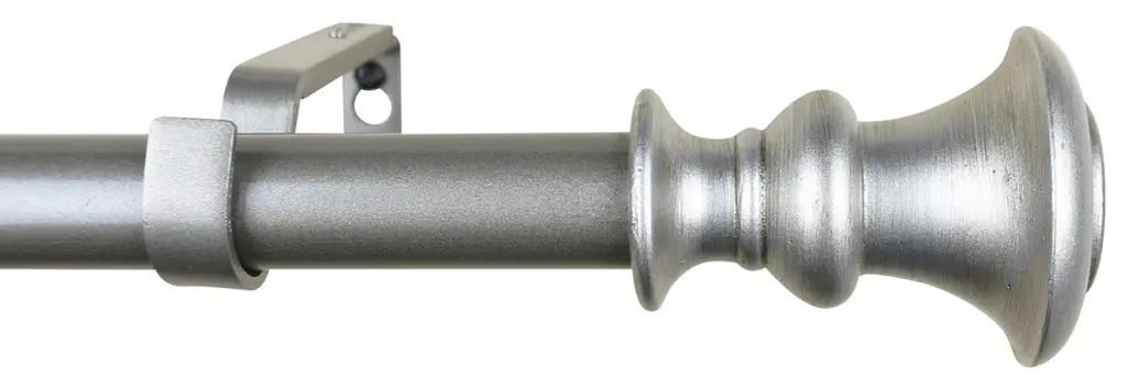 This rod set includes one rod, one set of two finials, and brackets in a pewter finish.The adjustable curtain rod measures 1" diameter and comes with polyresin finials. The finials measure 3 3/8" long and 2 7/8" in diameter. The rod extends from 48" to 84".Mounting hardware included for easy installation.Adjustable brackets measure 5" to 6 3/4" long, 4 1/2" to center of bracket cup; 1 3/4" wall mount span. 2 brackets included with 28"-48"; 3 brackets included with 48"-84" and 84"-120" lengths.