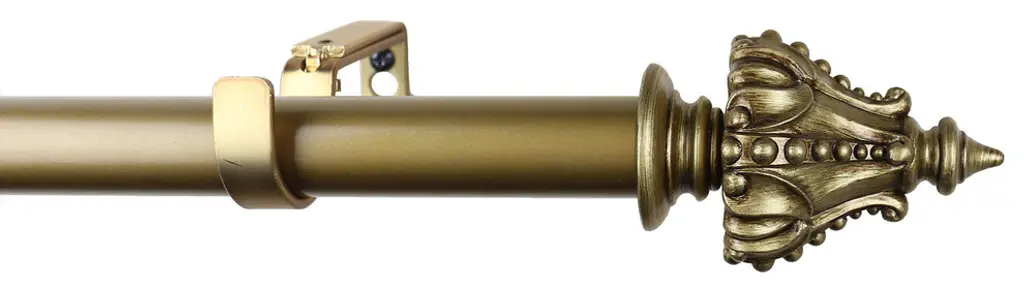 This rod set includes one rod and brackets in a renaissance gold finish, and one set of two finials in gilded French white and renaissance gold.The adjustable curtain rod measures 1" diameter and comes with polyresin finials. The finials measure 3 3/8" long and 2 1/4" in diameter. The rod extends from 48" to 84".Mounting hardware included for easy installation.Adjustable brackets measure 5" to 6 3/4" long, 4 1/2" to center of bracket cup; 1 3/4" wall mount span. 2 brackets included with 28"-48"; 3 brackets included with 48"-84" and 84"-120" lengths.