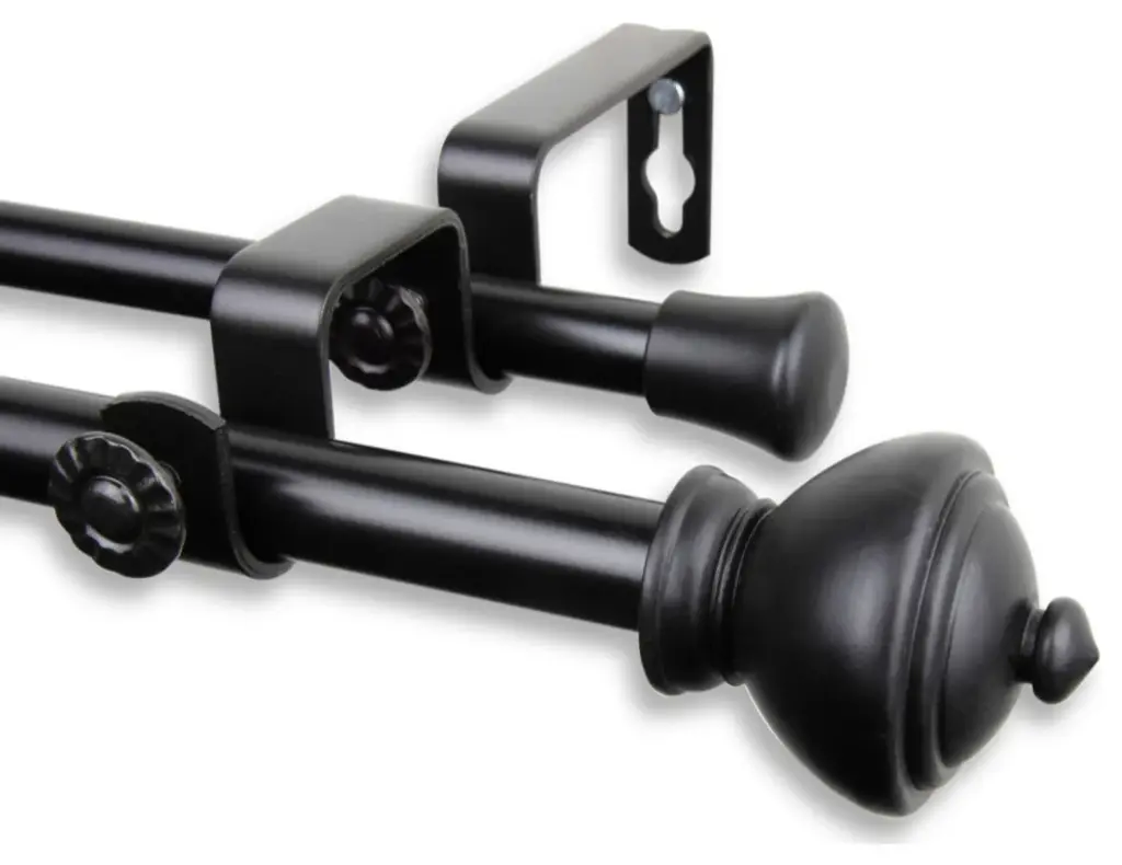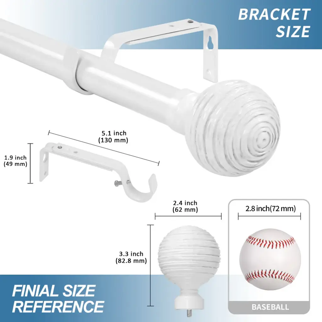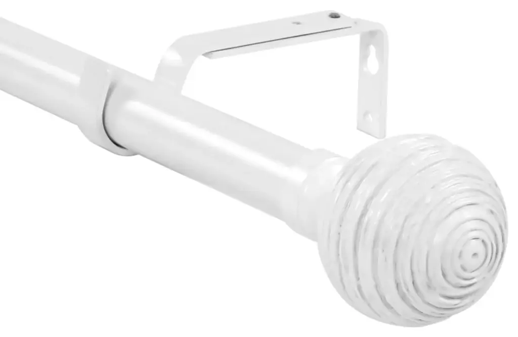 The rod set includes 1 rod, 1 set of two finials, and brackets in a glossy white finish.The adjustable curtain rod measures 1" diameter and comes with metal finials. The round finials measure 3 3/8" long and 2 1/2" in diameter. The rod extends from 48" to 84".Mounting hardware included for easy installation.Adjustable brackets measure 5" to 6 3/4" long, 4 1/2" to center of bracket cup; 1 3/4" wall mount span. 2 brackets included with 28"-48"; 3 brackets included with 48"-84" and 84"-120" lengths.