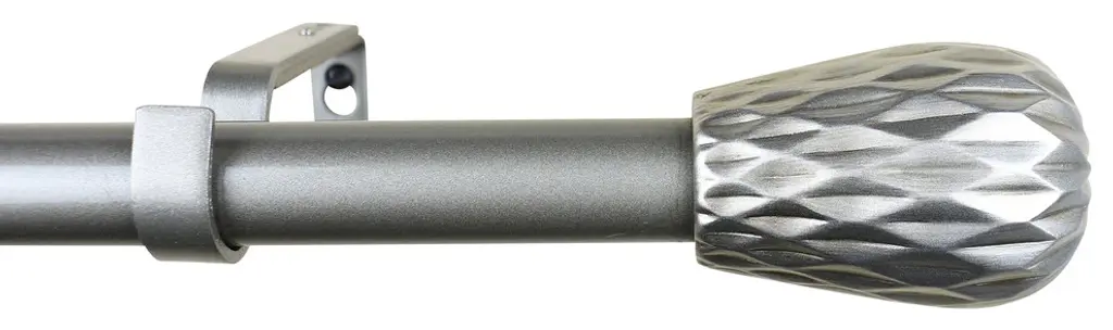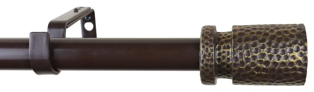 This rod set includes one rod and brackets in a black finish, and one set of two finials in a burnt gold finish.The adjustable curtain rod measures 1" diameter and comes with polyresin finials. The finials measure 3 1/8" long and 2 7/8" in diameter. The rod extends from 28" to 48".Mounting hardware included for easy installation.Adjustable brackets measure 5" to 6 3/4" long, 4 1/2" to center of bracket cup; 1 3/4" wall mount span. 2 brackets included with 28"-48"; 3 brackets included with 48"-84" and 84"-120" lengths.