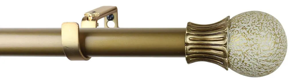 This rod set includes one rod and brackets in a French white finish, and one set of two finials in a gilded French white finish.The adjustable curtain rod measures 1" diameter and comes with polyresin finials. The finials measure 3 1/8" long and 2 7/8" in diameter. The rod extends from 28" to 48".Mounting hardware included for easy installation.Adjustable brackets measure 5" to 6 3/4" long, 4 1/2" to center of bracket cup; 1 3/4" wall mount span. 2 brackets included with 28"-48"; 3 brackets included with 48"-84" and 84"-120" lengths.