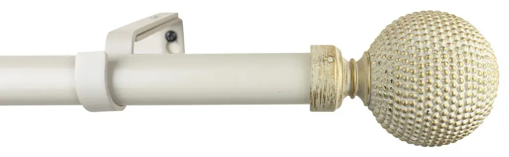 The rod set includes 1 rod, 1 set of two finials, and brackets in a glossy white finish.The adjustable curtain rod measures 1" diameter and comes with metal finials. The round finials measure 3 1/2" long and 2 1/2" in diameter. The rod extends from 28" to 48".Mounting hardware included for easy installation.Adjustable brackets measure 5" to 6 3/4" long, 4 1/2" to center of bracket cup; 1 3/4" wall mount span. 2 brackets included with 28"-48"; 3 brackets included with 48"-84" and 84"-120" lengths.