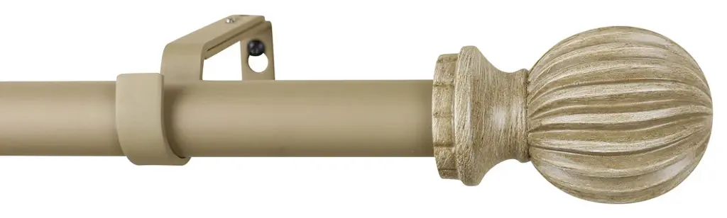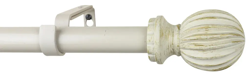 This rod set includes one rod and brackets in a French white finish, and one set of two finials in a gilded French white finish.The adjustable curtain rod measures 1" diameter and comes with polyresin finials. The finials measure 3 3/8" long and 2 1/4" in diameter. The rod extends from 28" to 48".Mounting hardware included for easy installation.Adjustable brackets measure 5" to 6 3/4" long, 4 1/2" to center of bracket cup; 1 3/4" wall mount span. 2 brackets included with 28"-48"; 3 brackets included with 48"-84" and 84"-120" lengths.