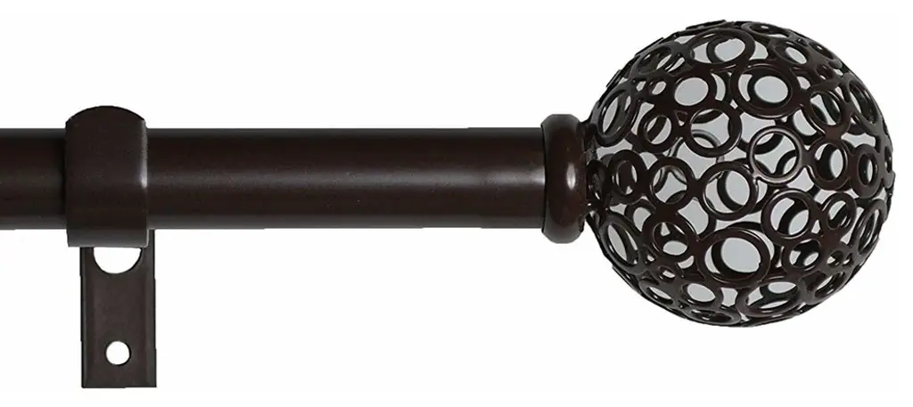 This rod set includes one rod and brackets in a black finish, and one set of two finials in a black and copper finish.The adjustable curtain rod measures 1" diameter and comes with polyresin finials. The finials measure 2 1/4" long and 2 1/4" in diameter. The rod extends from 28" to 48".Mounting hardware included for easy installation.Adjustable brackets measure 5" to 6 3/4" long, 4 1/2" to center of bracket cup; 1 3/4" wall mount span. 2 brackets included with 28"-48"; 3 brackets included with 48"-84" and 84"-120" lengths.