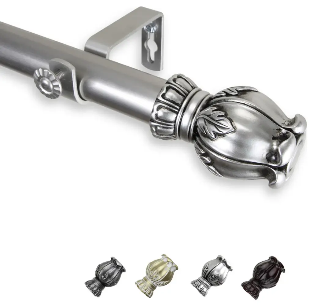 This rod set includes one rod, one set of two finials, and brackets in a pewter finish.The adjustable curtain rod measures 1" diameter and comes with polyresin finials. The finials measure 3 1/4" long and 2 1/8" in diameter. The rod extends from 28" to 48".Mounting hardware included for easy installation.Adjustable brackets measure 5" to 6 3/4" long, 4 1/2" to center of bracket cup; 1 3/4" wall mount span. 2 brackets included with 28"-48"; 3 brackets included with 48"-84" and 84"-120" lengths.