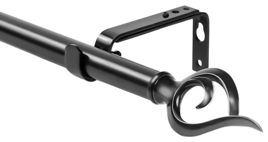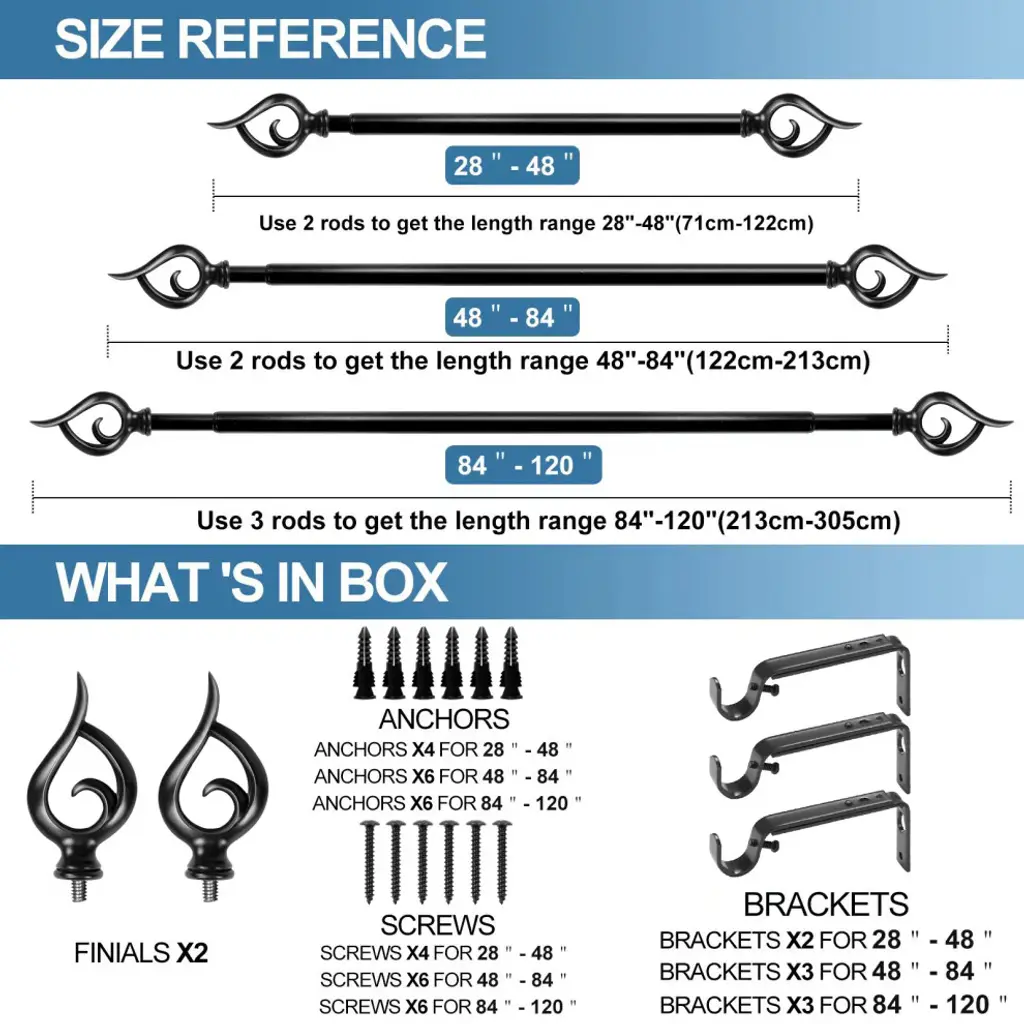 The rod set includes 1 rod, 1 set of two finials, and brackets in a black finish.The adjustable curtain rod measures 1" diameter and comes with decorative metal finials. The finials measure 5" long and 2 5/8" across. The rod extends from 48" to 84".Three matching brackets included. Adjustable brackets measure 5" to 6 3/4" long, 4 1/2" to center of bracket cup; 1 3/4" wall mount span.Available in 5 finishes: Black, Glossy White, Bronze, Brushed Steel, and Antique BrassMounting hardware included for easy installation.