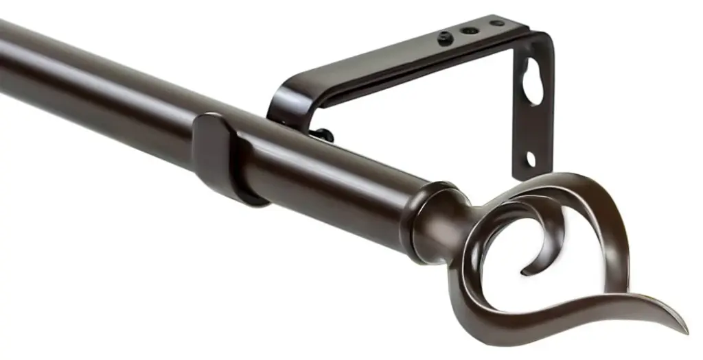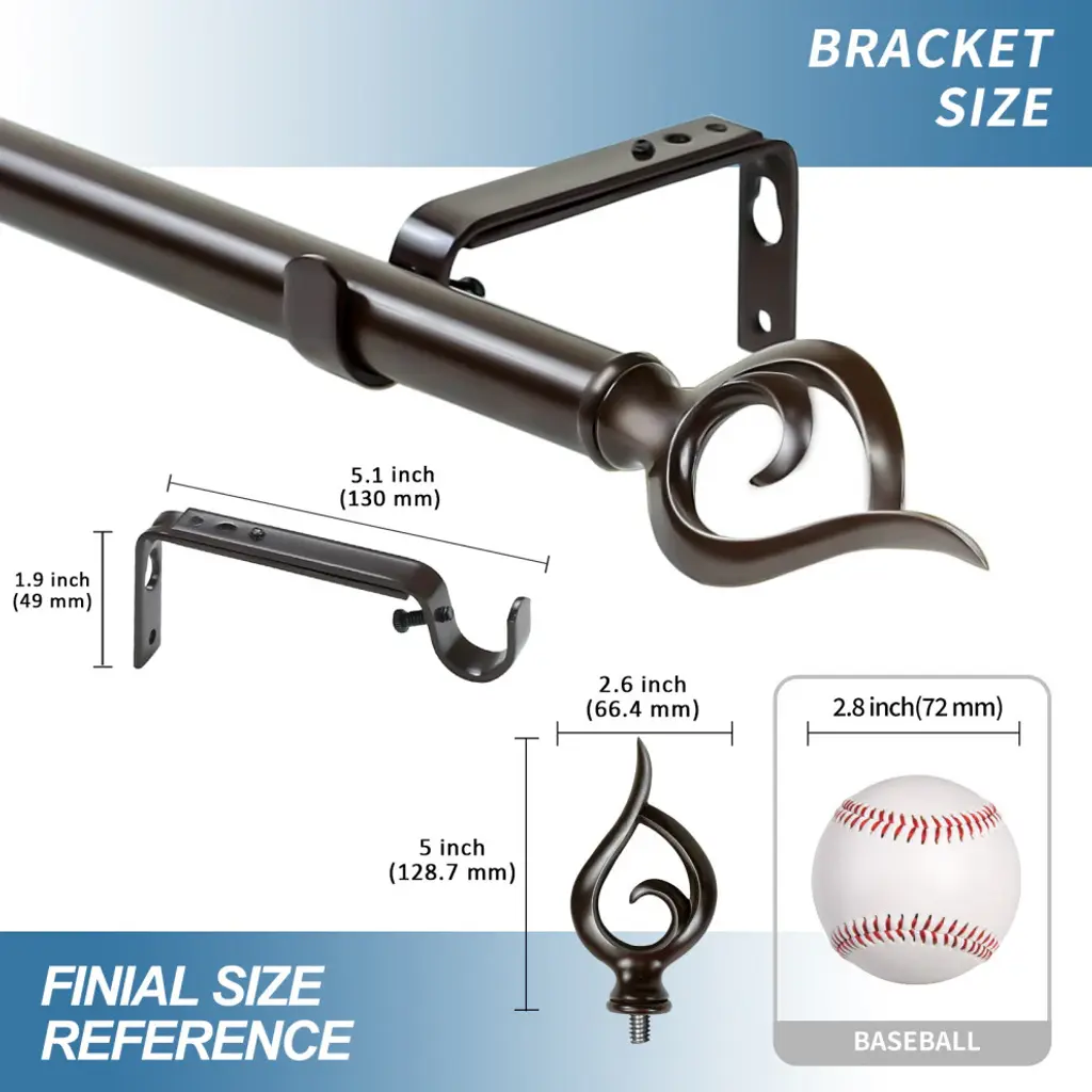 The rod set includes 1 rod, 1 set of two finials, and brackets in a bronze finish.The adjustable curtain rod measures 1" diameter and comes with decorative metal finials. The finials measure 5" long and 2 5/8" across. The rod extends from 84" to 120".Three matching brackets included. Adjustable brackets measure 5" to 6 3/4" long, 4 1/2" to center of bracket cup; 1 3/4" wall mount span.Available in 5 finishes: Black, Glossy White, Bronze, Brushed Steel, and Antique BrassMounting hardware included for easy installation.