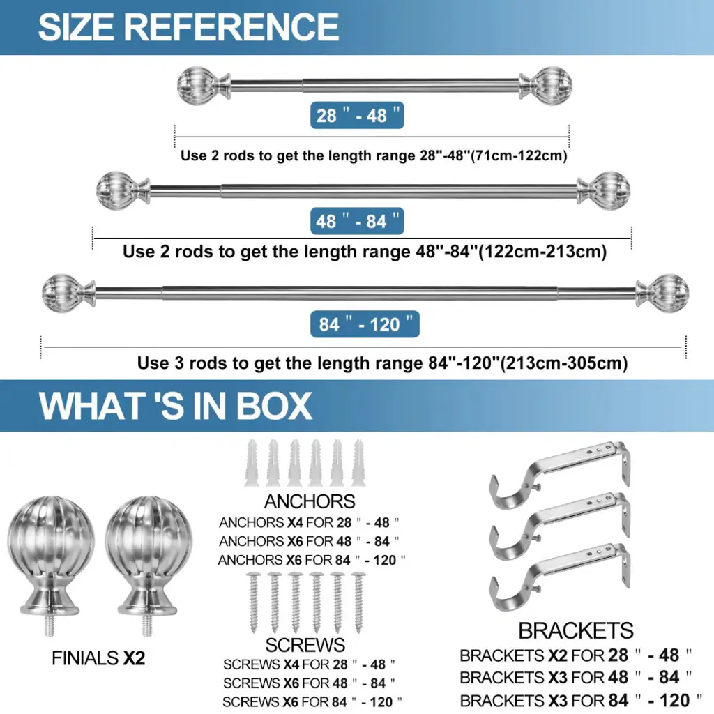 The rod set includes 1 rod, 1 set of two finials, and brackets in a brushed steel finish.The adjustable curtain rod measures 1" diameter and comes with round decorative finials. The finials measure 3" long and 2" in diameter. The rod extends from 48" to 84".Three matching brackets included. Adjustable brackets measure 5" to 6 3/4" long, 4 1/2" to center of bracket cup; 1 3/4" wall mount span.Available in 5 finishes: Black, Glossy White, Bronze, Brushed Steel, and Antique BrassMounting hardware included for easy installation.