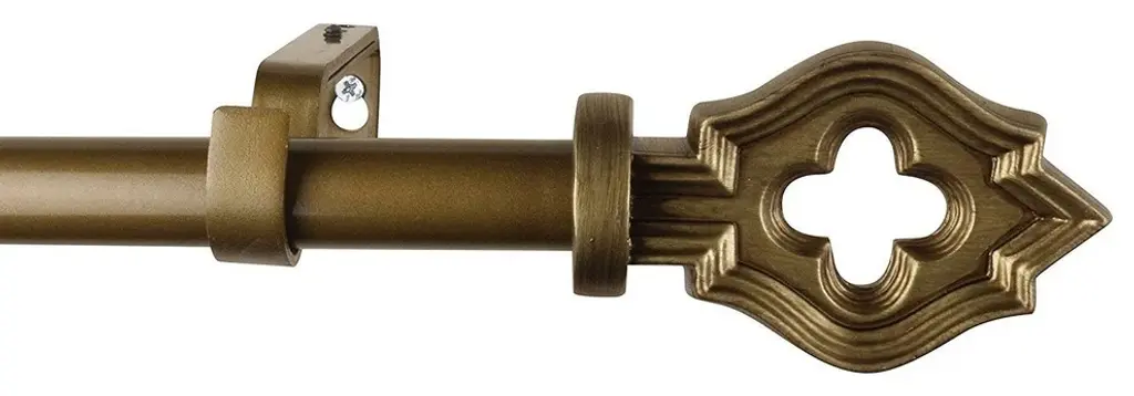 The rod set includes 1 rod, 1 set of two finials, and brackets in a renaissance gold finish.The adjustable curtain rod measures 1" diameter and comes with decorative polyresin finials. The finials measure 4 1/4" long and 2 1/2" in diameter. The rod extends from 84" to 120".Available in 2 finishes: Burnt Gold and Renaissance Gold.Mounting hardware included for easy installation.Adjustable brackets measure 5" to 6 3/4" long, 4 1/2" to center of bracket cup; 1 3/4" wall mount span. 2 brackets included with 28"-48"; 3 brackets included with 48"-84" and 84"-120" lengths.