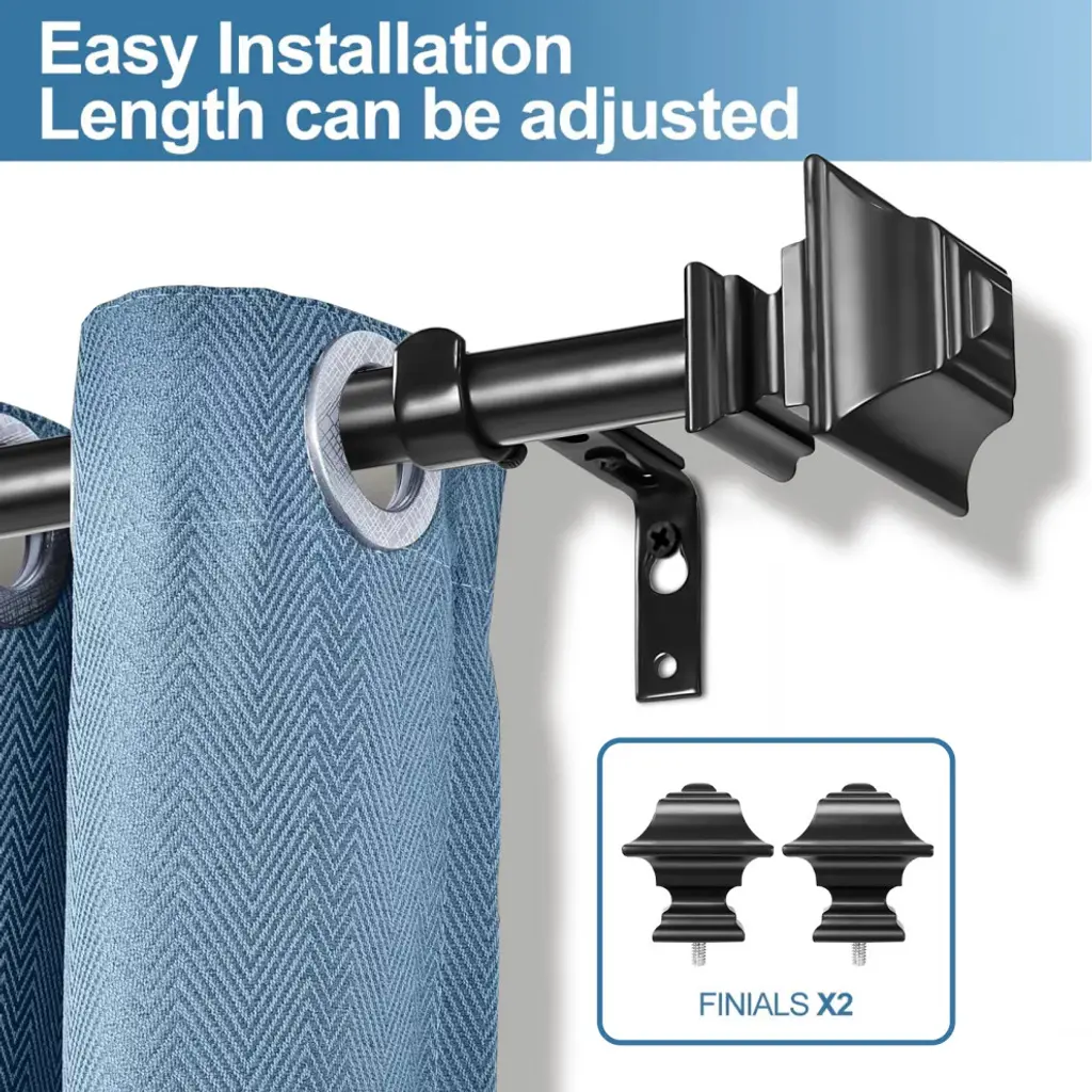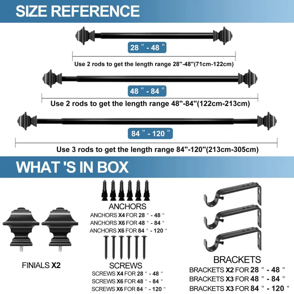 The rod set includes 1 rod, 1 set of two finials, and brackets in a black finish.The adjustable curtain rod measures 1" diameter and comes with square decorative finials. The finials measure 2 5/8" tall and 2 3/8" square. The rod extends from 28" to 48".Available in 5 finishes: Black, Glossy White, Bronze, Brushed Steel, and Antique BrassMounting hardware included for easy installation.