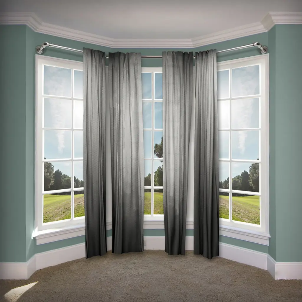 Our new 1 in. diameter adjustable bay window curtain rods are perfect for mounting valances and curtains over bay windows. Each side is adjustable from 23-41 in. and the center piece adjusts from 41-78 in. Industrial style designed rods connect via corner connector that allows for almost 360 degrees of rotation.