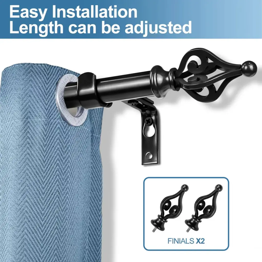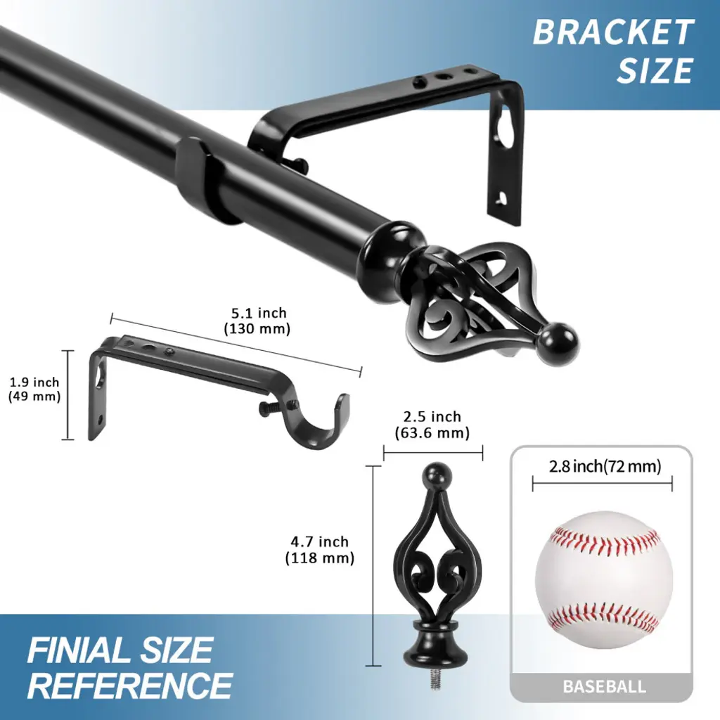 The rod set includes 1 rod, 1 set of two finials, and brackets in a black finish.The adjustable curtain rod measures 1" diameter and comes with decorative metal finials. The finials measure 5" long and 2 1/2" across. The rod extends from 28" to 48".Available in 5 finishes: Black, Glossy White, Bronze, Brushed Steel, and Antique BrassMounting hardware included for easy installation.