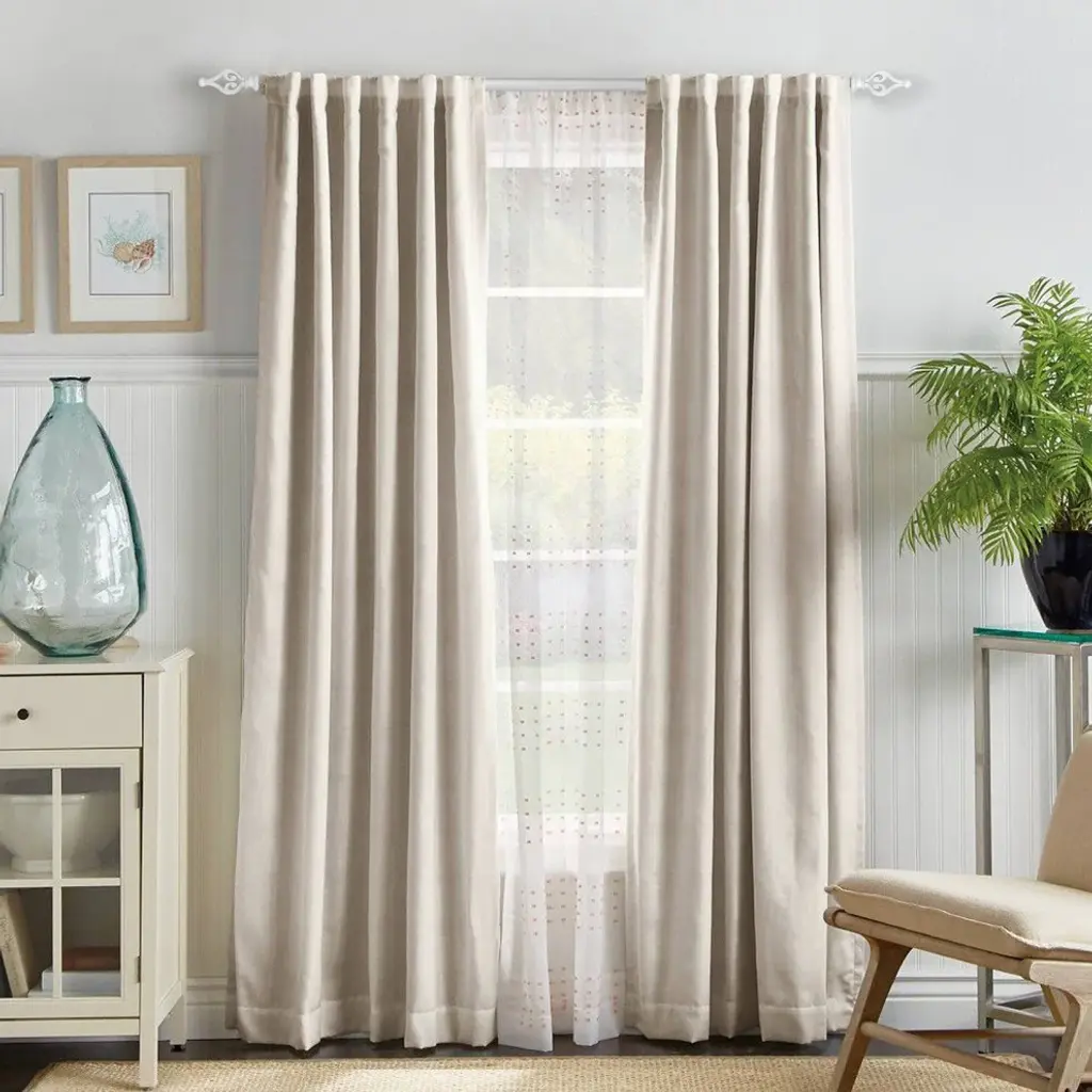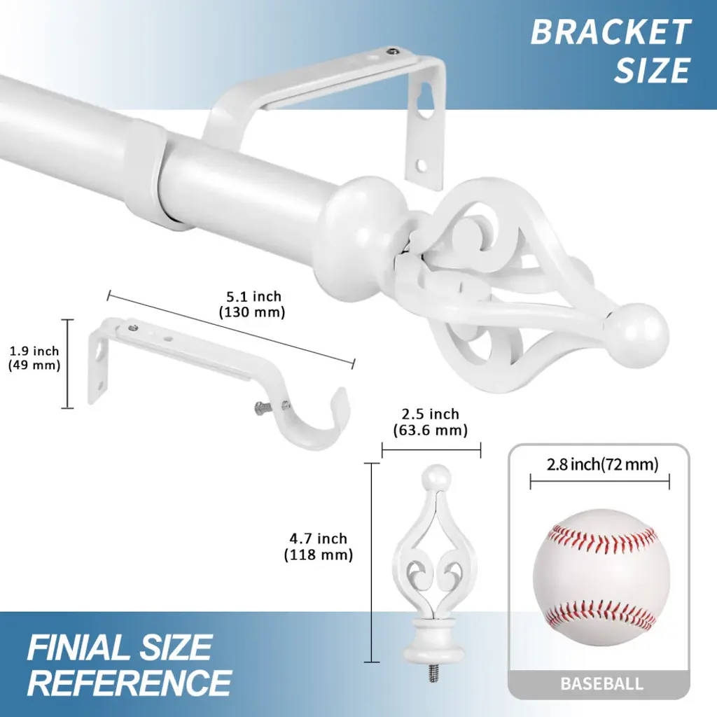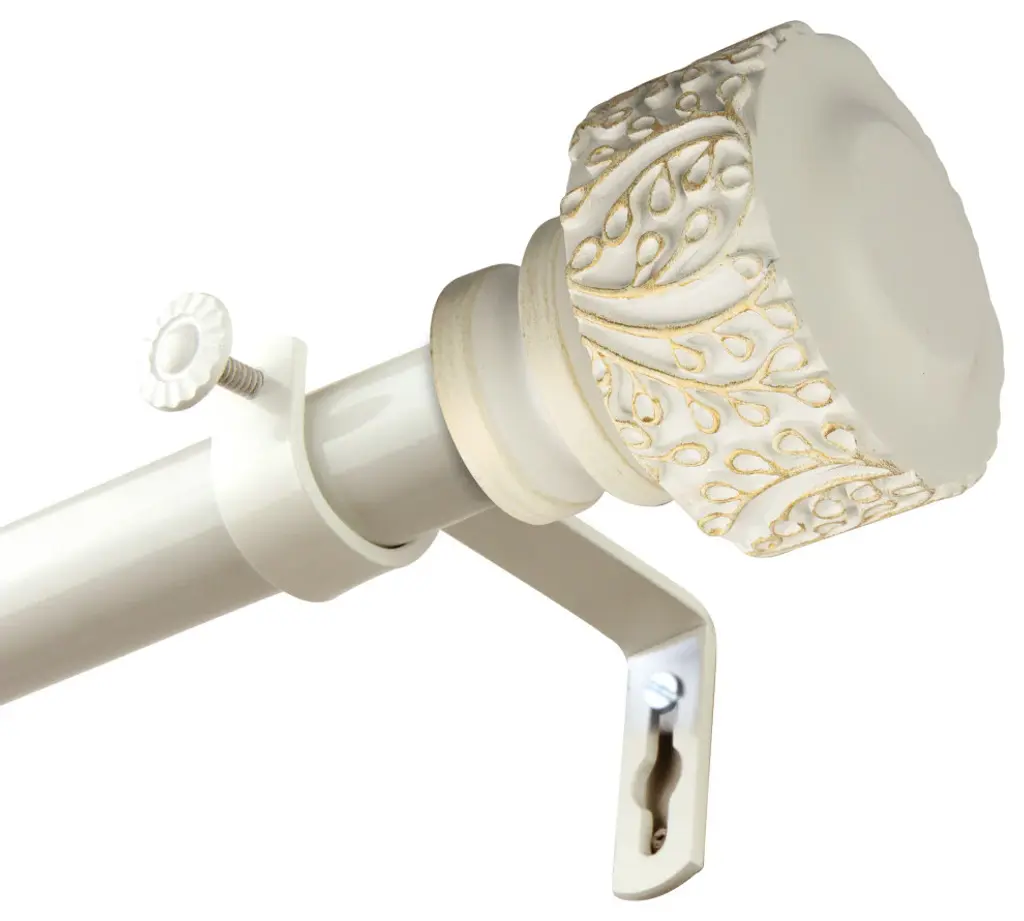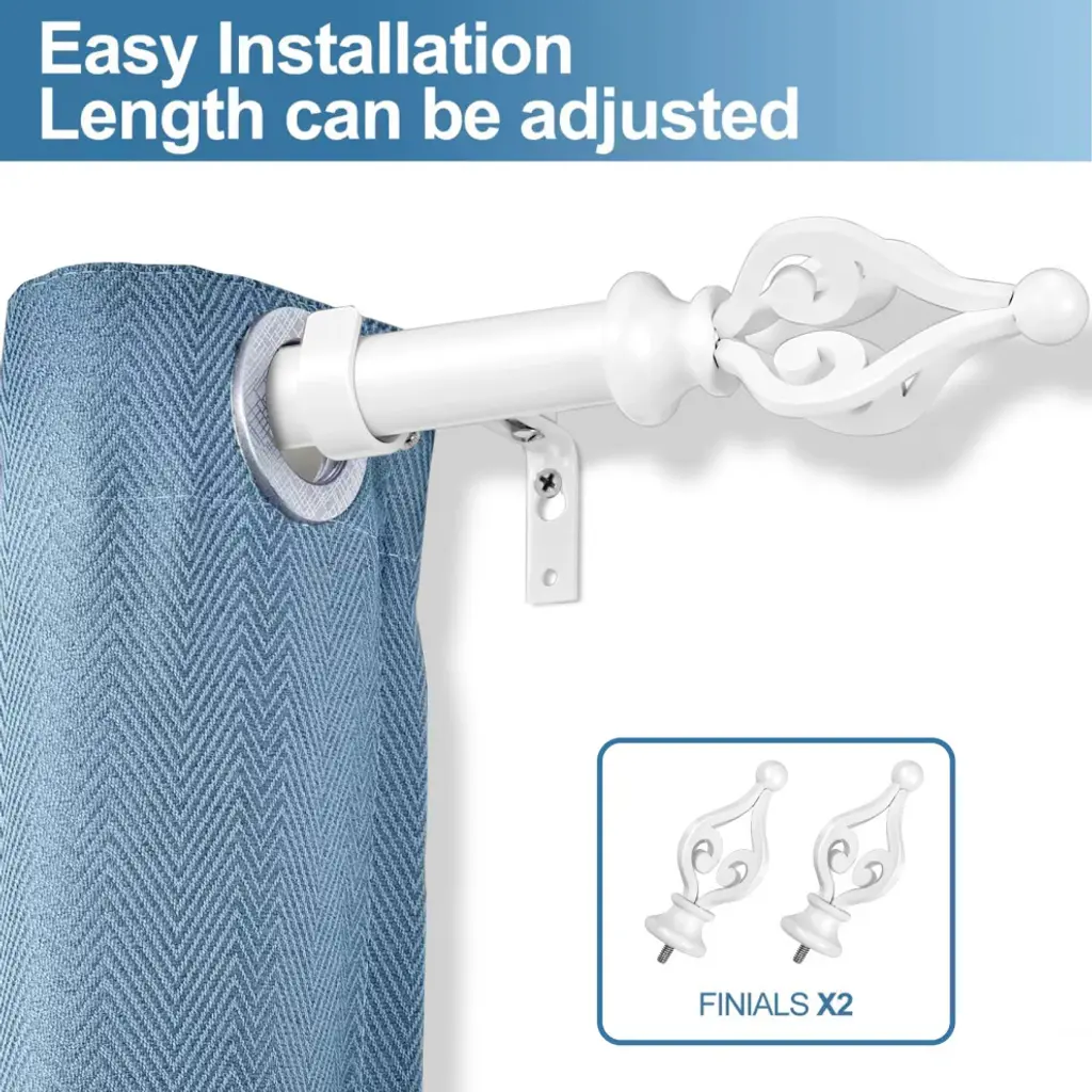 The rod set includes 1 rod, 1 set of two finials, and brackets in a glossy white finish.The adjustable curtain rod measures 1" diameter and comes with decorative metal finials. The finials measure 5" long and 2 1/2" across. The rod extends from 28" to 48".Available in 5 finishes: Black, Glossy White, Bronze, Brushed Steel, and Antique BrassMounting hardware included for easy installation.