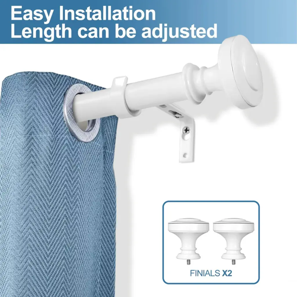 The rod set includes 1 rod, 1 set of two finials, and brackets in a glossy white finish.The adjustable curtain rod measures 1" diameter and comes with decorative finials. The finials measure 2 1/2" tall and 2 1/2" in diameter. The rod extends from 28" to 48".Available in 5 finishes: Black, Glossy White, Bronze, Brushed Steel, and Antique BrassMounting hardware included for easy installation.