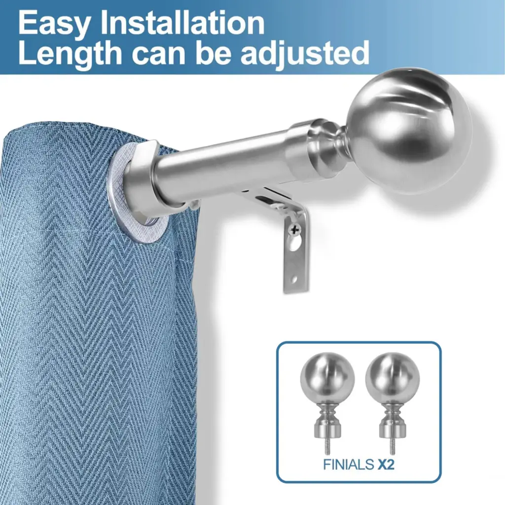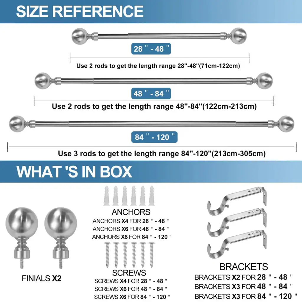 The rod set includes 1 rod, 1 set of two finials, and brackets in a brushed steel finish.The adjustable curtain rod measures 1" diameter and comes with round decorative finials. The finials measure 3 5/8" long and 2 1/8" across. The rod extends from 48" to 84".Available in 5 finishes: Black, Glossy White, Bronze, Brushed Steel, and Antique BrassMounting hardware included for easy installation.