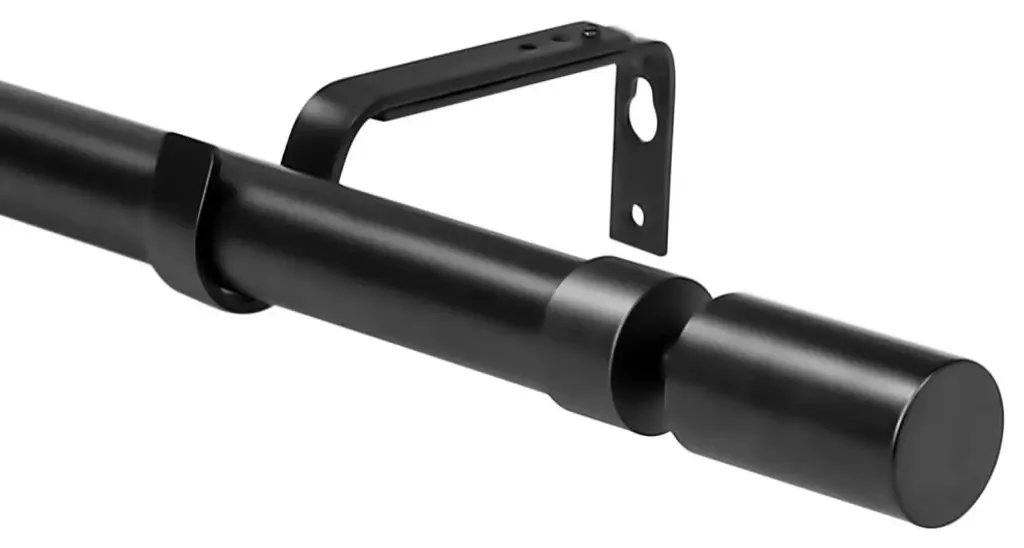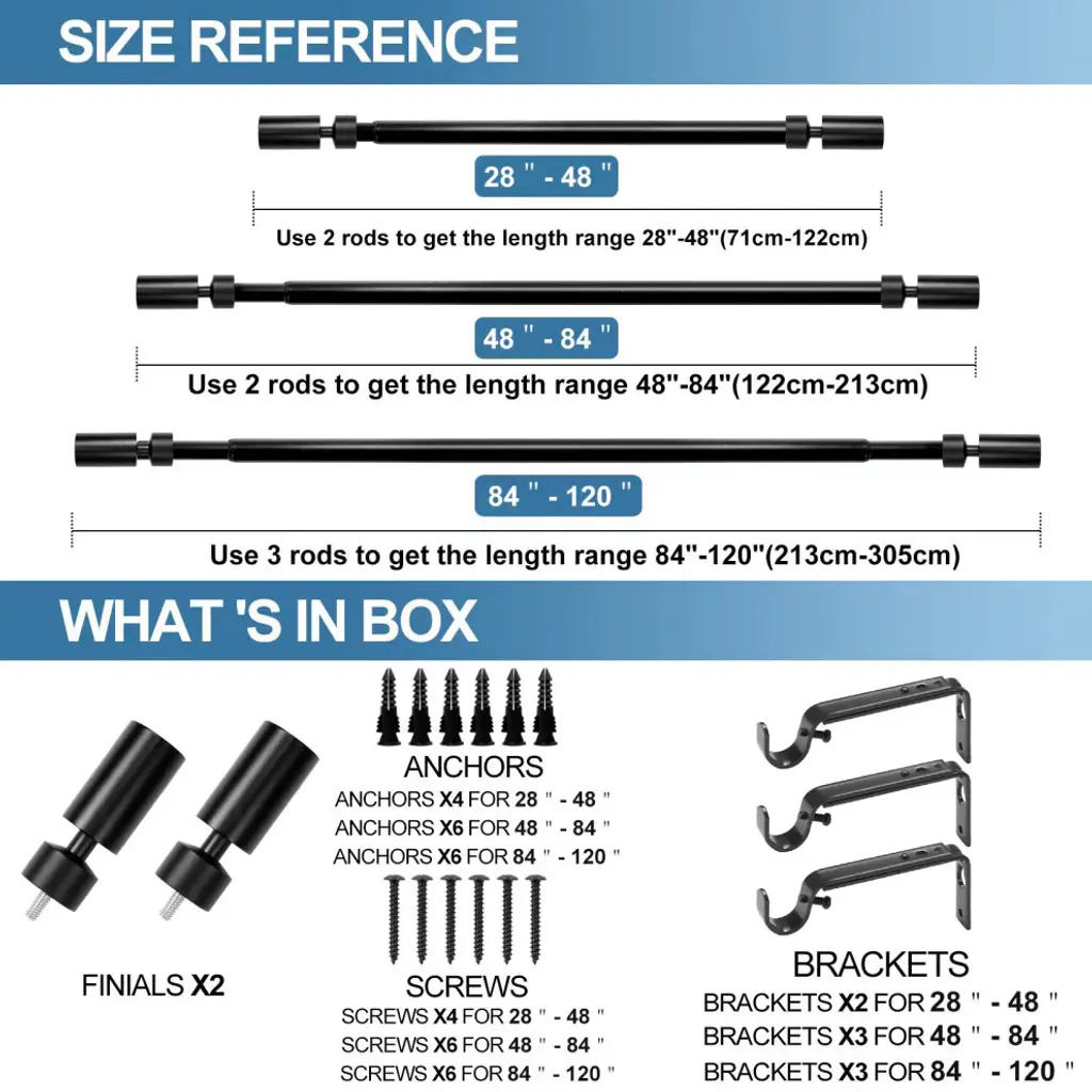 The rod set includes 1 rod, 1 set of two finials, and brackets in a black finish.The adjustable curtain rod measures 1" diameter and comes with metal finials. The finials measures 3 1/4" long and 1 1/8" in diameter. The rod extends from 28" to 48".Available in 8 finishes: Black, Glossy White, Bronze, Brushed Steel, Antique Brass, Pewter, French White, and Satin GoldMounting hardware included for easy installation.Adjustable brackets measure 5" to 6 3/4" long, 4 1/2" to center of bracket cup; 1 3/4" wall mount span. 2 brackets included with 28"-48"; 3 brackets included with 48"-84" and 84"-120" lengths.