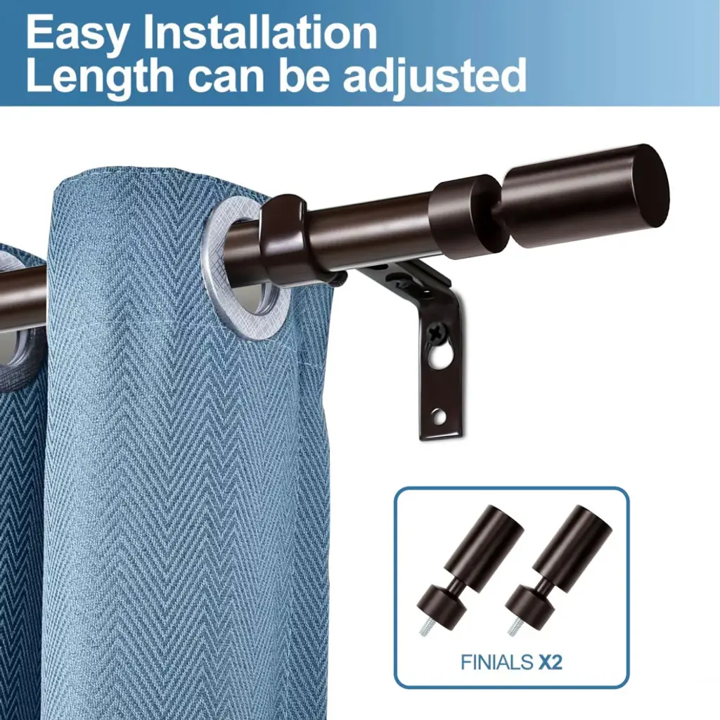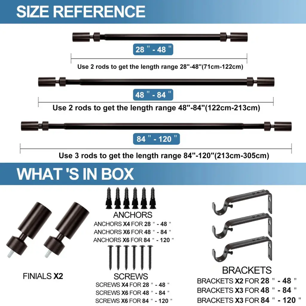 The rod set includes 1 rod, 1 set of two finials, and brackets in a bronze finish.The adjustable curtain rod measures 1" diameter and comes with metal finials. The finials measures 3 1/4" long and 1 1/8" in diameter. The rod extends from 28" to 48".Available in 8 finishes: Black, Glossy White, Bronze, Brushed Steel, Antique Brass, Pewter, French White, and Satin GoldMounting hardware included for easy installation.Adjustable brackets measure 5" to 6 3/4" long, 4 1/2" to center of bracket cup; 1 3/4" wall mount span. 2 brackets included with 28"-48"; 3 brackets included with 48"-84" and 84"-120" lengths.