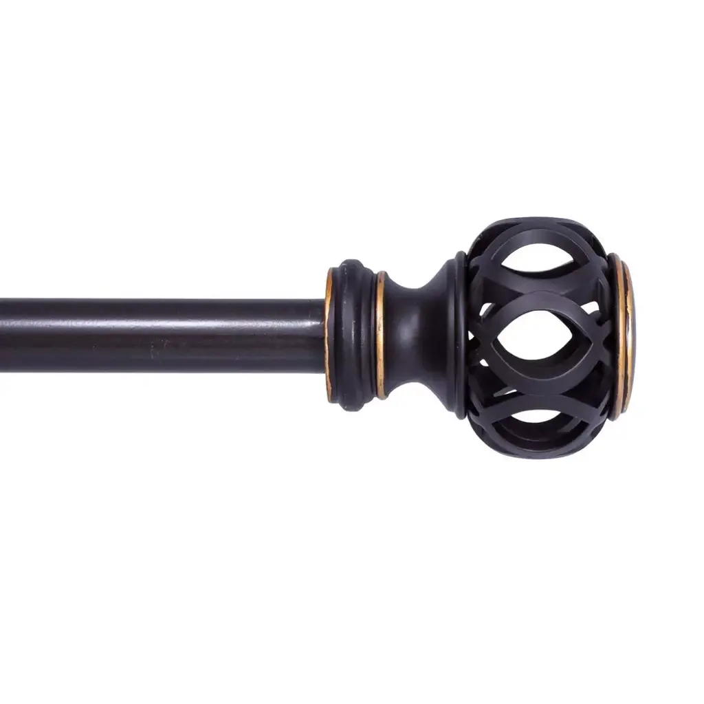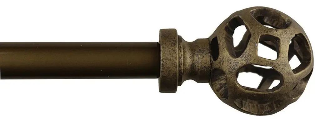 The rod set includes 1 set of two finials in a burnt gold finish, 1 rod, and brackets in a black finish.The adjustable curtain rod measures 1" diameter and comes with decorative polyresin finials. The finials measure 3 5/8" long and 2 5/8" in diameter. The rod extends from 28" to 48".Available in 4 finishes: Renaissance Gold, Burnt Gold, Pewter, and Mahogany.Mounting hardware included for easy installation.Adjustable brackets measure 5" to 6 3/4" long, 4 1/2" to center of bracket cup; 1 3/4" wall mount span. 2 brackets included with 28"-48"; 3 brackets included with 48"-84" and 84"-120" lengths.