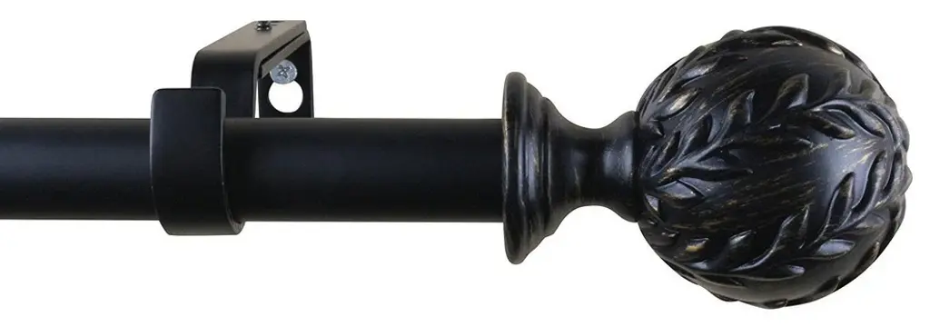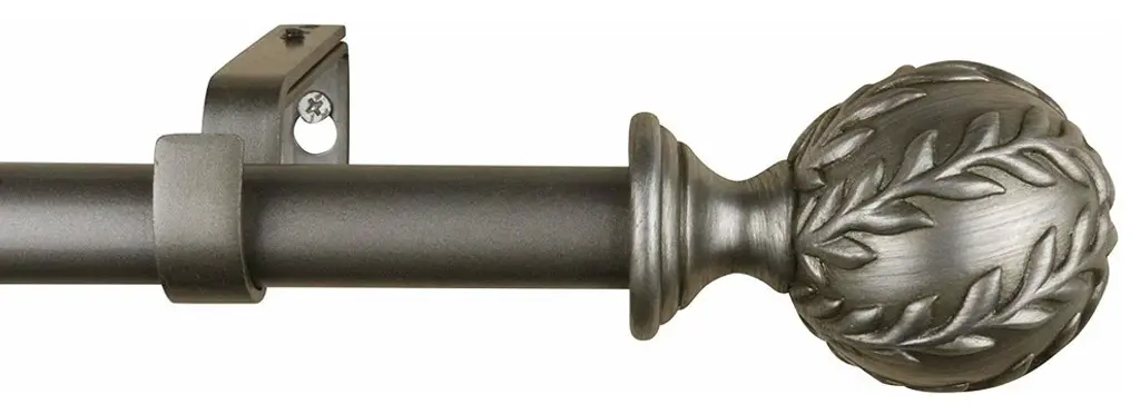 The rod set includes 1 rod, 1 set of two finials, and brackets in a pewter finish.The adjustable curtain rod measures 1" diameter and comes with decorative polyresin finials. The finials measure 3 3/8" long and 2 3/8" in diameter. The rod extends from 28" to 48".Available in 4 finishes: Renaissance Gold, Burnt Gold, Pewter, and Gilded French White.Mounting hardware included for easy installation.Adjustable brackets measure 5" to 6 3/4" long, 4 1/2" to center of bracket cup; 1 3/4" wall mount span. 2 brackets included with 28"-48"; 3 brackets included with 48"-84" and 84"-120" lengths.
