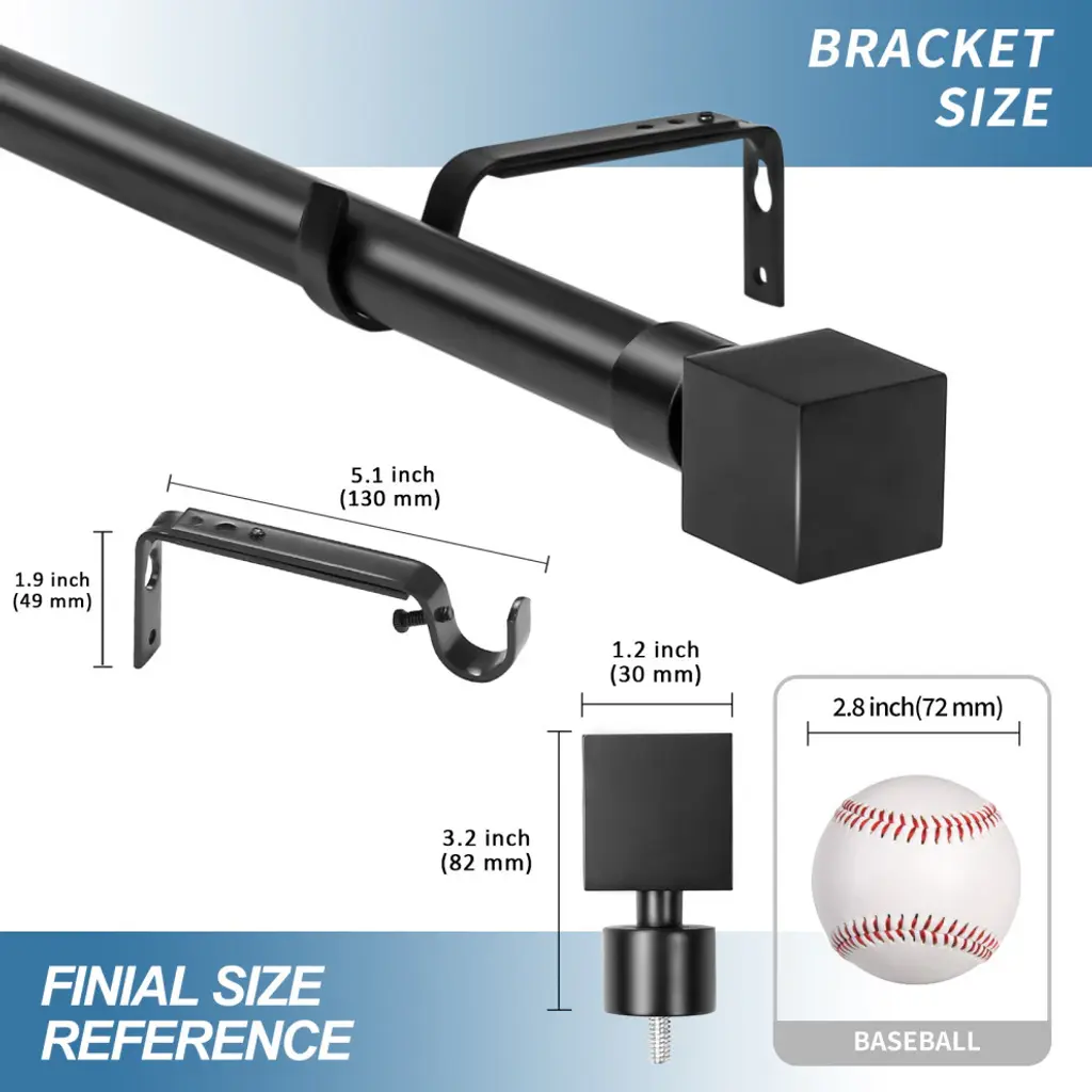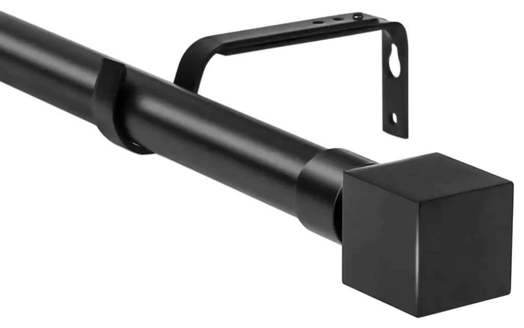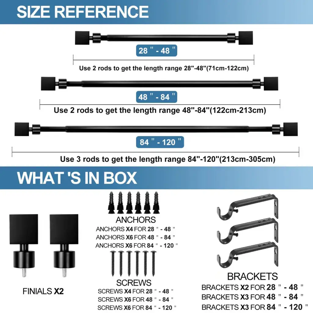 The rod set includes 1 rod, 1 set of two finials, and brackets in a black finish.The adjustable curtain rod measures 1" diameter and comes with metal finials. The finials measures 2 7/8" long and 1 1/2" square . The rod extends from 84" to 120".Available in 8 finishes: Black, Glossy White, Bronze, Brushed Steel, Antique Brass, Pewter, French White, and Satin GoldMounting hardware included for easy installation.Adjustable brackets measure 5" to 6 3/4" long, 4 1/2" to center of bracket cup; 1 3/4" wall mount span. 2 brackets included with 28"-48"; 3 brackets included with 48"-84" and 84"-120" lengths.