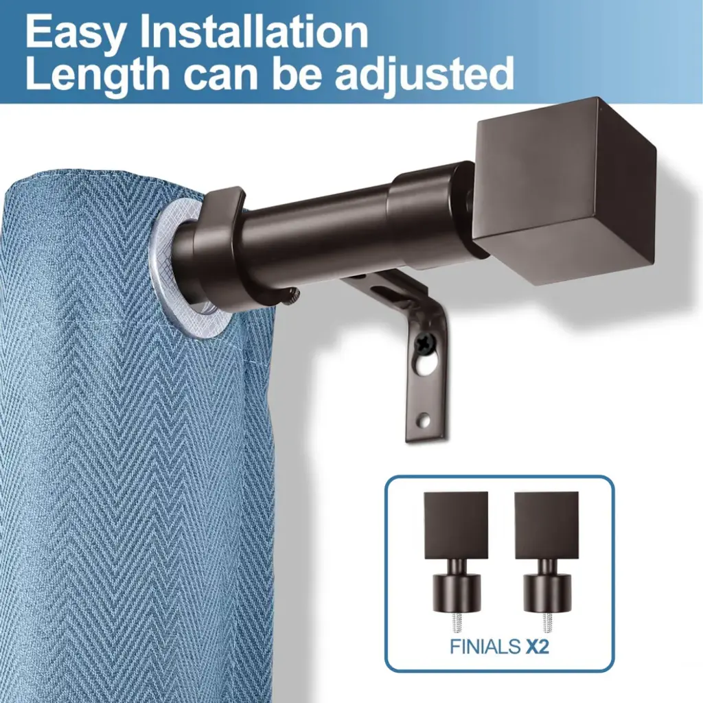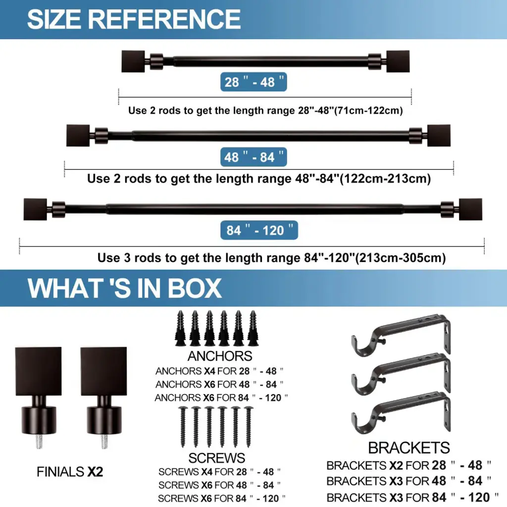 The rod set includes 1 rod, 1 set of two finials, and brackets in a bronze finish.The adjustable curtain rod measures 1" diameter and comes with metal finials. The finials measures 2 7/8" long and 1 1/2" square . The rod extends from 84" to 120".Available in 8 finishes: Black, Glossy White, Bronze, Brushed Steel, Antique Brass, Pewter, French White, and Satin GoldMounting hardware included for easy installation.Adjustable brackets measure 5" to 6 3/4" long, 4 1/2" to center of bracket cup; 1 3/4" wall mount span. 2 brackets included with 28"-48"; 3 brackets included with 48"-84" and 84"-120" lengths.