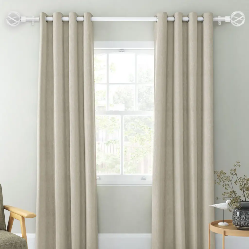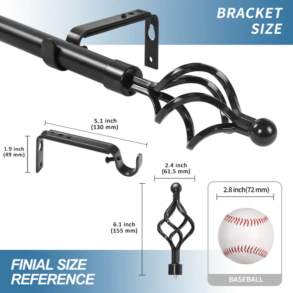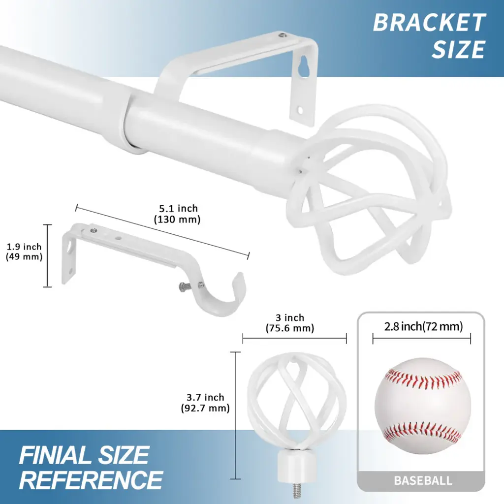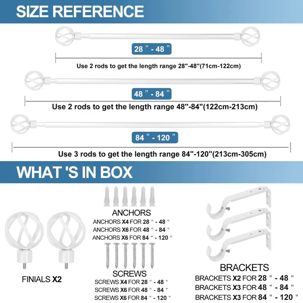 The rod set includes 1 rod, 1 set of two finials, and brackets in a glossy white finish.The adjustable curtain rod measures 1" diameter and comes with round decorative finials. The finials measure 3" in diameter and 3 1/2" long. The rod extends from 84" to 120".Available in 5 finishes: Black, Glossy White, Bronze, Brushed Steel, and Antique BrassMounting hardware included for easy installation.