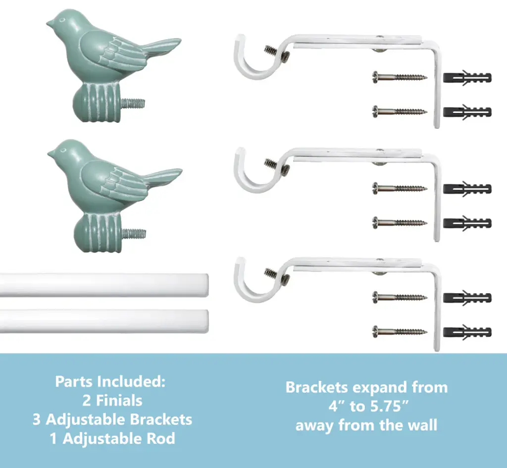 TOP MODERN DESIGN: Super cute bird finials bring a designer''s touch to your contemporary window treatments.HIGH QUALITY: Rustproof, Heavy Duty Sturdy Window Rod Set. Can hold up to 30 lbs. Rods and brackets are made of all HIGH QUALITY METAL. Finials are made of durable poly resin.SIZE: Available in 3 adjustable lengths: 28"-48", 48"-84", and 84"-120". 3/4" outer rod diameter. This rod is suitable for use with curtain rings 1" or larger. Rings not included Extendable from 28"-48"/48"-84"/84"-120"/ Adjustable brackets allow for mounting the rod from 4" - 5 3/4" away from the wall. Bird finials measures 3" long and 2.5" tall. EASY SET-UP: All mounting hardware is included: Matching brackets, 1 telescoping curtain rod, screws, drywall anchors, and installation instructions. One additional center support bracket comes with 48"-84"/84"-120" rod set. It can be wall mounted indoor or outdoor. Install it in minutes!COLOR: Available in multiple color options: Burnt Gold, Bronze with Gold, Gilded White, Glossy White, Silver Pewter, Cottage, Blue, Pink, Yellow, Teal.