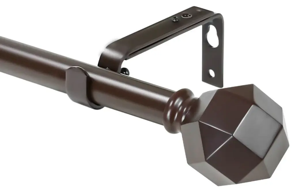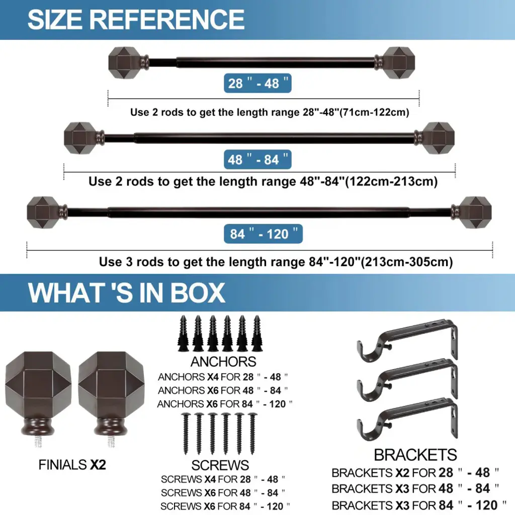 The adjustable curtain rod measures 3/4" diameter and comes with metal finials.The finials measure 2 1/2" long and 2" in diameter. The rod extends from 28" to 48".Mounting hardware included for easy installation. Adjustable brackets measure 4" to 5 1/2" long.Two brackets included with 28"-48"; 3 brackets included with 48"-84" and 84"-120" lengths.