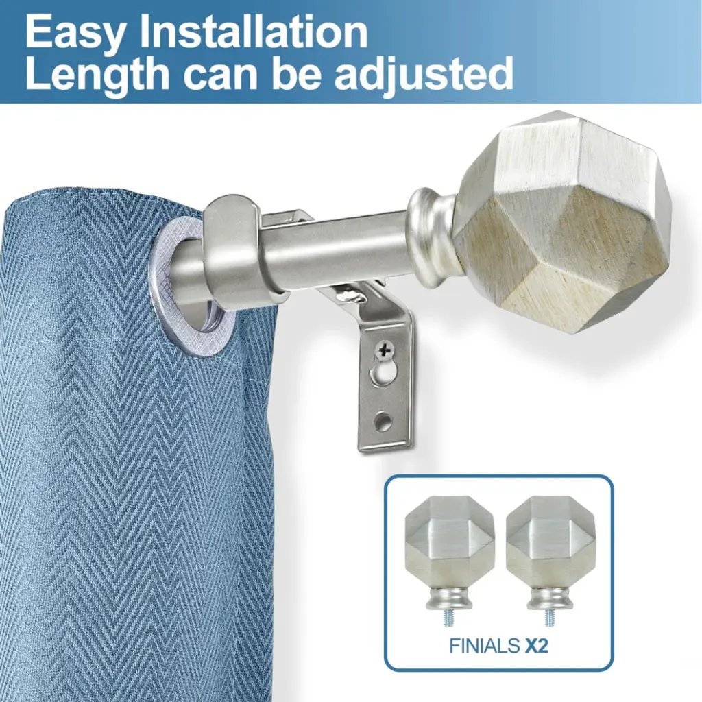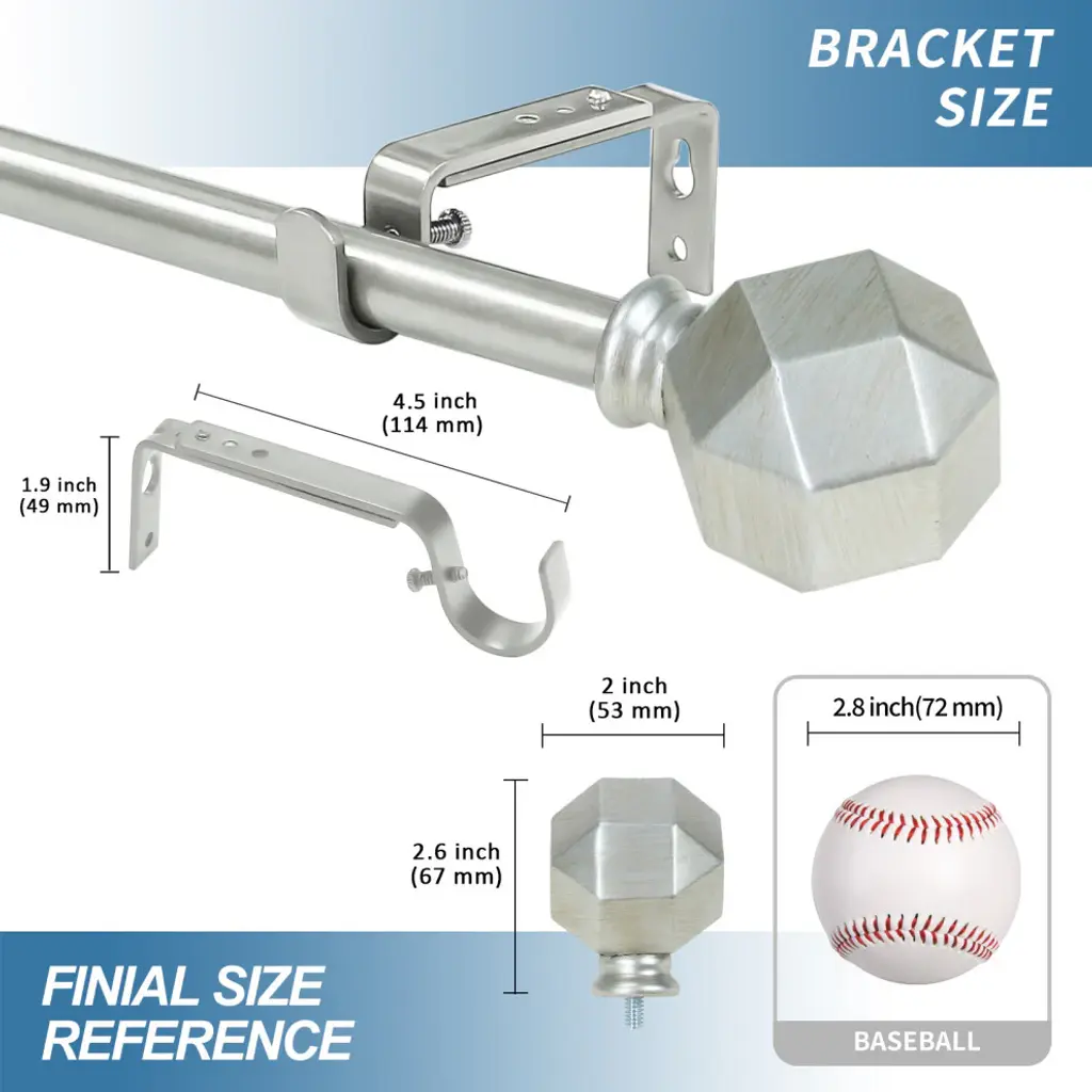 The adjustable curtain rod measures 3/4" diameter and comes with metal finials.The finials measure 2 1/2" long and 2" in diameter. The rod extends from 84" to 120".Mounting hardware included for easy installation.Adjustable brackets measure 4" to 5 1/2" long.Two brackets included with 28"-48"; 3 brackets included with 48"-84" and 84"-120" lengths.