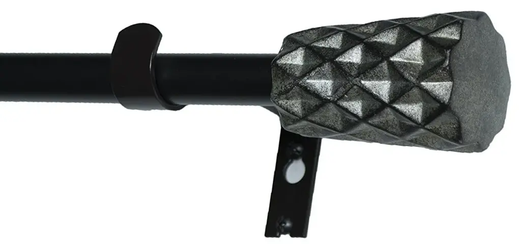 The adjustable curtain rod measures 3/4" diameter and comes with polyresin finials.The finials measure 3" long and 1 7/8" in diameter. The rod extends from 48" to 84".Mounting hardware included for easy installation.Adjustable brackets measure 4" to 5 1/2" long.Two brackets included with 28"-48"; 3 brackets included with 48"-84" and 84"-120" lengths.