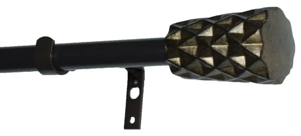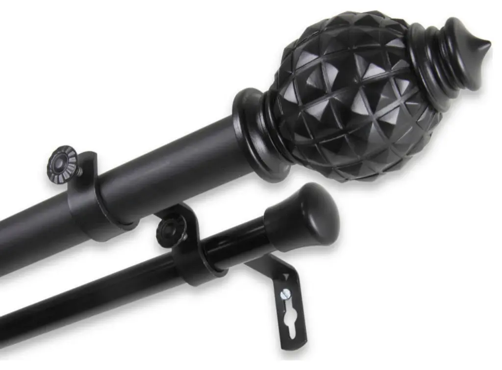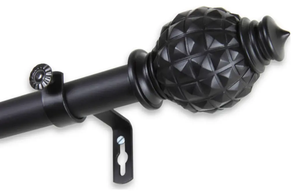 The adjustable curtain rod measures 3/4" diameter and comes with polyresin finials.The finials measure 3" long and 1 7/8" in diameter. The rod extends from 84" to 120".Mounting hardware included for easy installation.Adjustable brackets measure 4" to 5 1/2" long.Two brackets included with 28"-48"; 3 brackets included with 48"-84" and 84"-120" lengths.