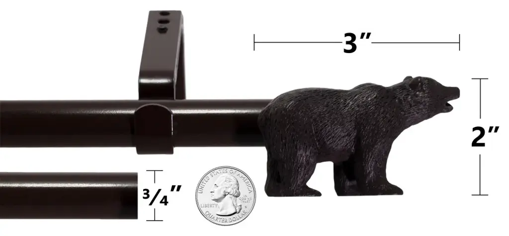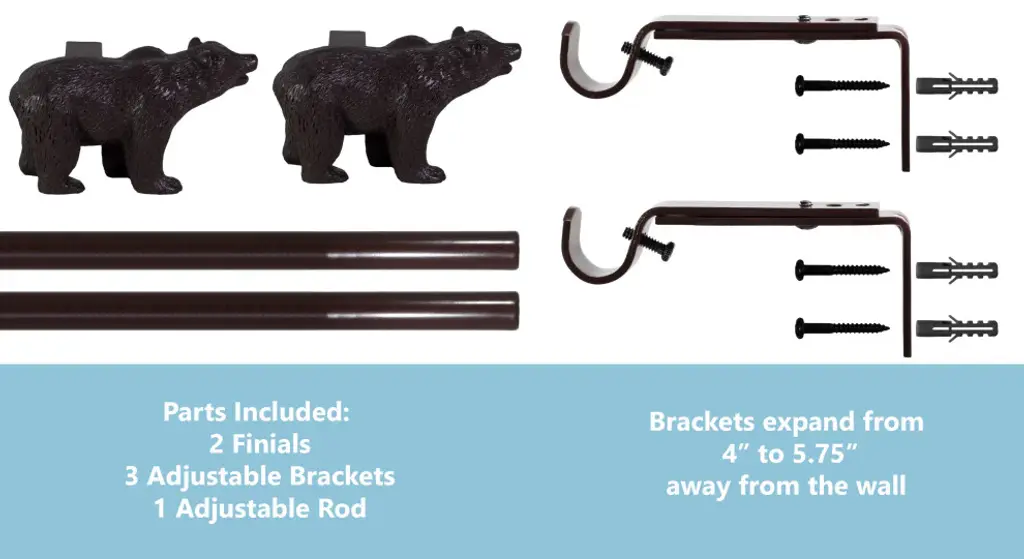 [ DECORATIVE WINDOW TREATMENT ] Unique bear shaped finials make it easy to bring the spirit of a cozy cabin into any room. Ornament a window, accent an entryway, or even hang a drapery with ease! [ FLEXIBLE DESIGN ] Urbanest"™s telescoping 3/4"� diameter metal curtain rod extends from X to X inches long accommodating most window sizes. Ideal for kitchens, dining rooms, bedrooms, living rooms or home offices.[ EASY SETUP ] Mounts curtains, curtain rings, or panels easily to fit any occasion. Required mounting hardware included: two (2) brackets• , four (4) drywall anchors, and four (4) screws. (Rod, two (2) finials, and installation instructions are also included) • one additional center support bracket, extra screws and drywall anchors included for 48"�-84"� and 84"�-120"� size variations. [ SIZING & DIMENSIONS ] The Urbanest Bear curtain rod is available in three adjustable sizes: 28"�-48"�, 48"�-84"�, and 84"�-120"�. Brackets extend from 4"� to 5.75"� away from the wall. The heavy duty rod supports up to 30 lbs. 1"� inner diameter minimum suggested curtain ring size. [ COLOR VARIETY ] Available in a variety of designer colors: Oil Rubbed Bronze (ORB), Renaissance Gold, Pewter and Cottage.
