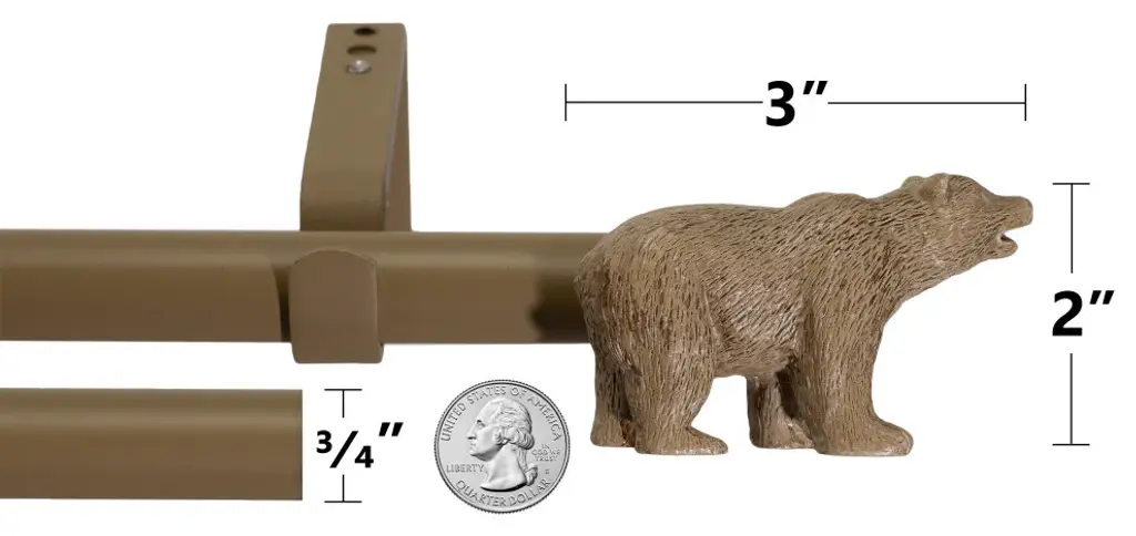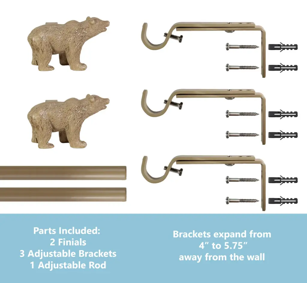 [ DECORATIVE WINDOW TREATMENT ] Unique bear shaped finials make it easy to bring the spirit of a cozy cabin into any room. Ornament a window, accent an entryway, or even hang a drapery with ease! [ FLEXIBLE DESIGN ] Urbanest"™s telescoping 3/4"� diameter metal curtain rod extends from X to X inches long accommodating most window sizes. Ideal for kitchens, dining rooms, bedrooms, living rooms or home offices.[ EASY SETUP ] Mounts curtains, curtain rings, or panels easily to fit any occasion. Required mounting hardware included: two (2) brackets• , four (4) drywall anchors, and four (4) screws. (Rod, two (2) finials, and installation instructions are also included) • one additional center support bracket, extra screws and drywall anchors included for 48"�-84"� and 84"�-120"� size variations. [ SIZING & DIMENSIONS ] The Urbanest Bear curtain rod is available in three adjustable sizes: 28"�-48"�, 48"�-84"�, and 84"�-120"�. Brackets extend from 4"� to 5.75"� away from the wall. The heavy duty rod supports up to 30 lbs. 1"� inner diameter minimum suggested curtain ring size. [ COLOR VARIETY ] Available in a variety of designer colors: Oil Rubbed Bronze (ORB), Renaissance Gold, Pewter and Cottage.