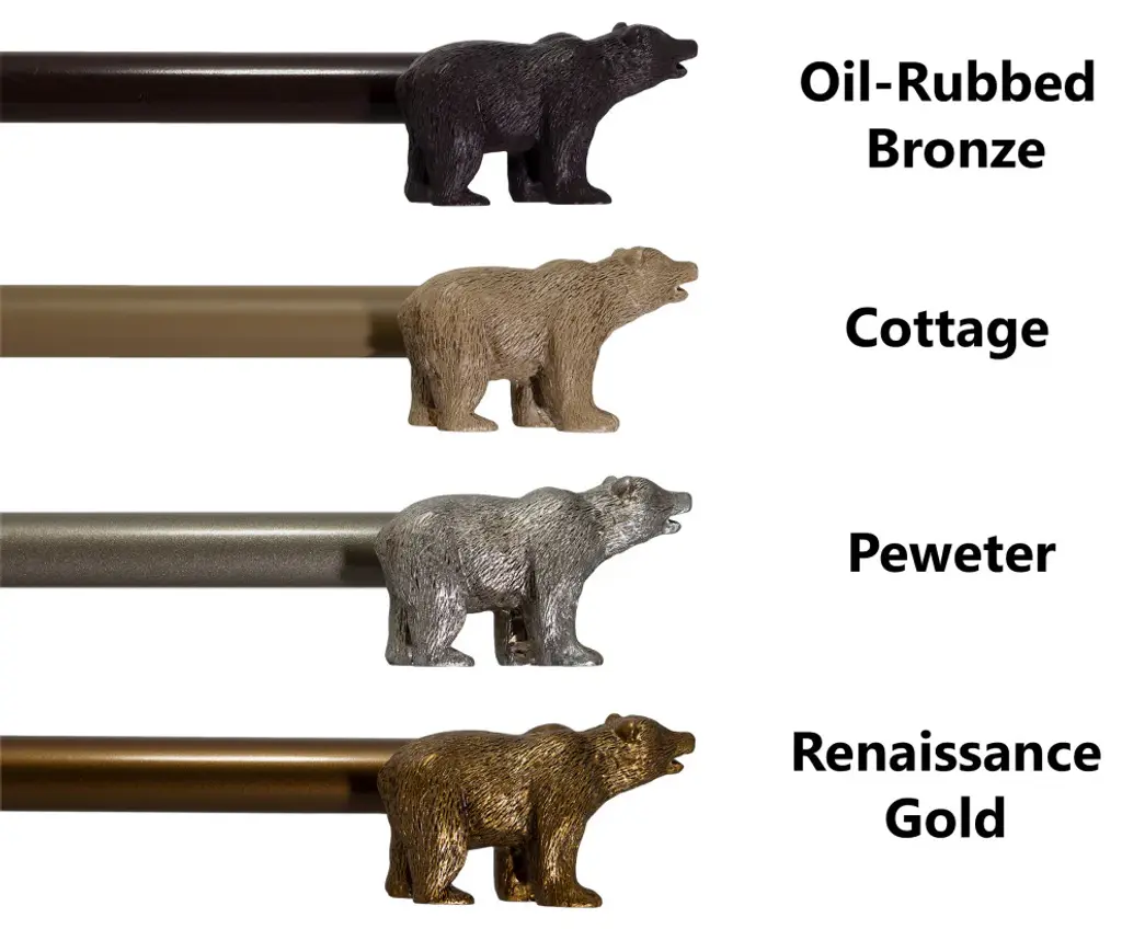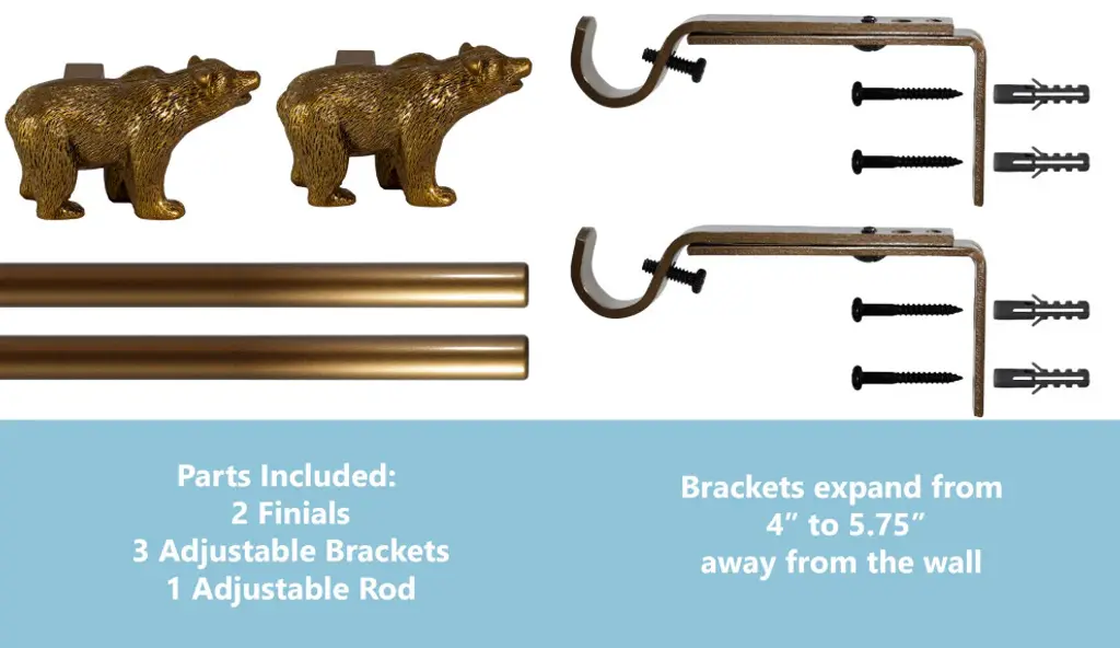 [ DECORATIVE WINDOW TREATMENT ] Unique bear shaped finials make it easy to bring the spirit of a cozy cabin into any room. Ornament a window, accent an entryway, or even hang a drapery with ease! [ FLEXIBLE DESIGN ] Urbanest"™s telescoping 3/4"� diameter metal curtain rod extends from X to X inches long accommodating most window sizes. Ideal for kitchens, dining rooms, bedrooms, living rooms or home offices.[ EASY SETUP ] Mounts curtains, curtain rings, or panels easily to fit any occasion. Required mounting hardware included: two (2) brackets• , four (4) drywall anchors, and four (4) screws. (Rod, two (2) finials, and installation instructions are also included) • one additional center support bracket, extra screws and drywall anchors included for 48"�-84"� and 84"�-120"� size variations. [ SIZING & DIMENSIONS ] The Urbanest Bear curtain rod is available in three adjustable sizes: 28"�-48"�, 48"�-84"�, and 84"�-120"�. Brackets extend from 4"� to 5.75"� away from the wall. The heavy duty rod supports up to 30 lbs. 1"� inner diameter minimum suggested curtain ring size. [ COLOR VARIETY ] Available in a variety of designer colors: Oil Rubbed Bronze (ORB), Renaissance Gold, Pewter and Cottage.