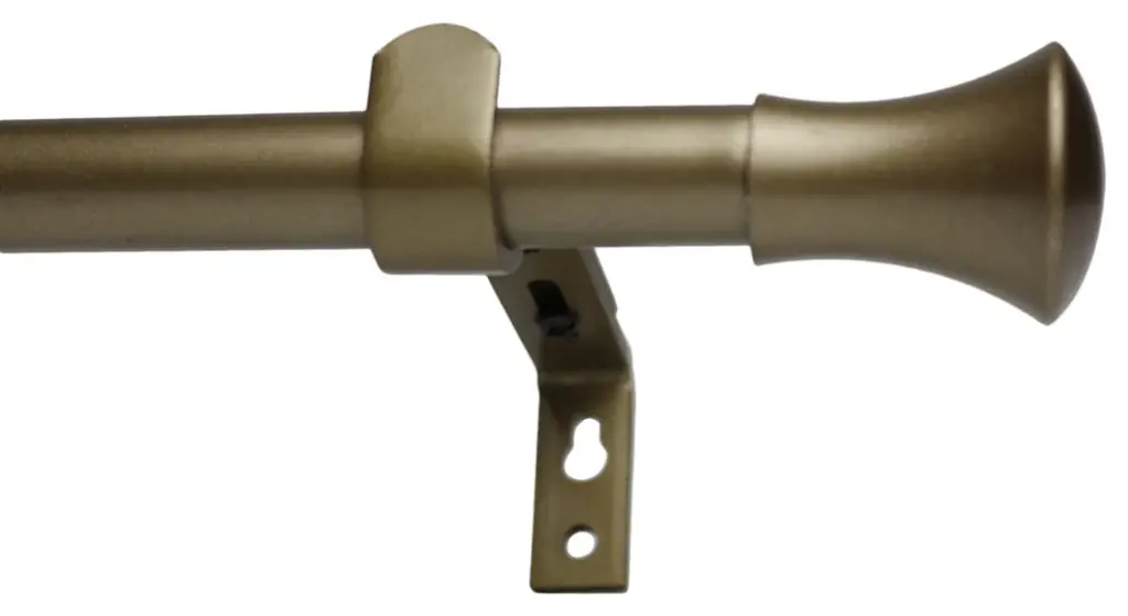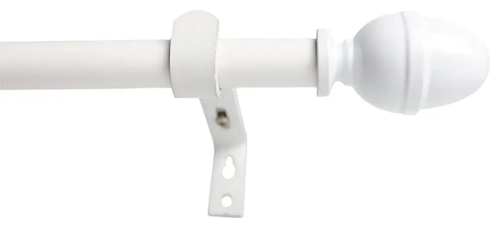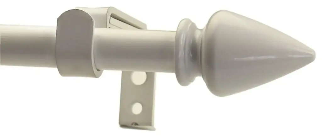 This set includes one 28"-48" adjustable rod, two finials, two matching brackets, and mounting hardware. The rod has a glossy white finish, with spear-shaped finials in glossy white. The outer diameter of the rod is 5/8"; the inner diameter is 1/2". Uses 3-4" or larger curtain rings (sold separately). The brackets adjust from 4" to 5 1/2". The finials measure 2 1/8" long and 1 3/8" across. Available in 7 finishes: Black, Glossy White, Bronze, Brushed Steel, Antique Brass, Pewter, and Antique Gold.