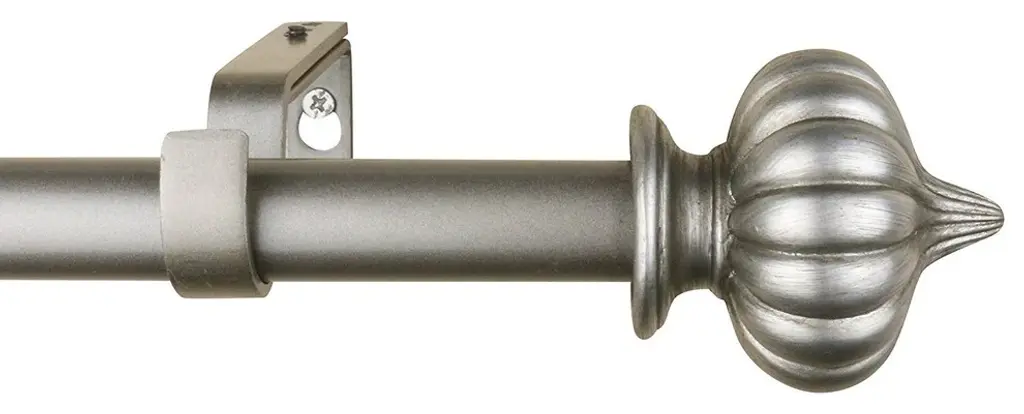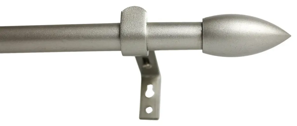 This set includes one 28"-48" adjustable rod, two finials, two matching brackets, and mounting hardware. The rod has an pewter finish, with spear-shaped finials in pewter. The outer diameter of the rod is 5/8"; the inner diameter is 1/2". Uses 3-4" or larger curtain rings (sold separately). The brackets adjust from 4" to 5 1/2". The finials measure 2 1/8" long and 1 3/8" across. Available in 7 finishes: Black, Glossy White, Bronze, Brushed Steel, pewter, Pewter, and Antique Gold.