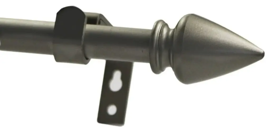 This set includes one 84"-120" adjustable rod, two finials, three matching brackets, and mounting hardware. The rod has a bronze finish, with spear-shaped finials in bronze. The outer diameter of the rod is 5/8"; the inner diameter is 1/2". Uses 3-4" or larger curtain rings (sold separately). The brackets adjust from 4" to 5 1/2". The finials measure 2 1/8" long and 1 3/8" across. Available in 7 finishes: Black, Glossy White, Bronze, Brushed Steel, Antique Brass, Pewter, and Antique Gold.