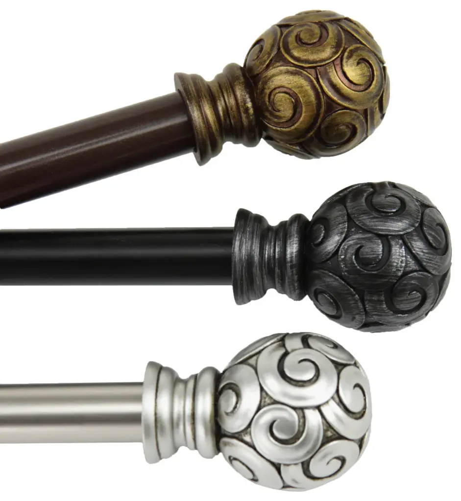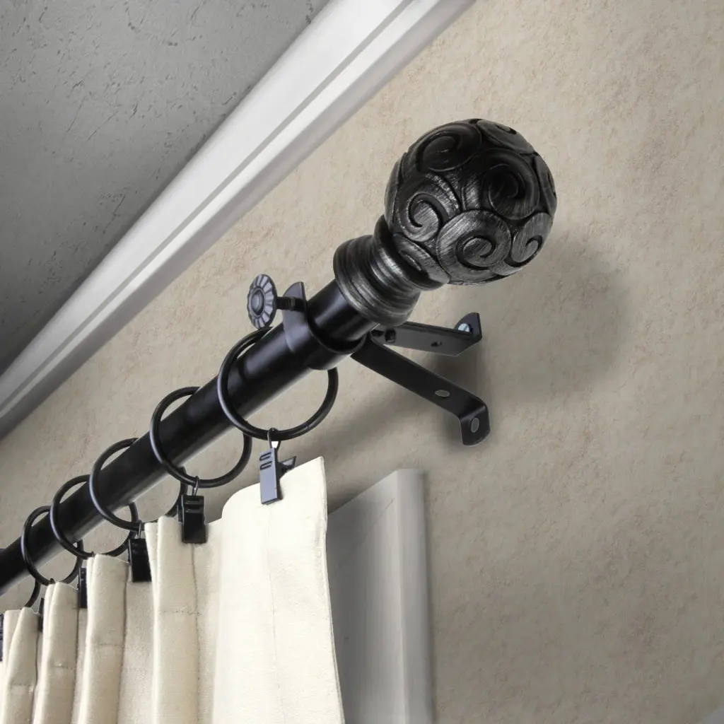 Introduce an elegant touch to your window treatment with this beautiful 13/16" diameter curtain rod set, made of high quality steel rods. Includes telescoping steel pole, mounting hardware, brackets, and 2 finials Projection: 2.875" Finial measurement: 2.5" W x 1.75" H x 1.75" D