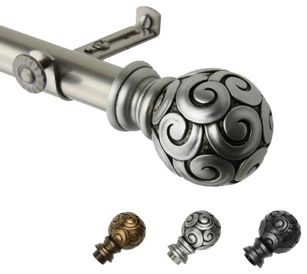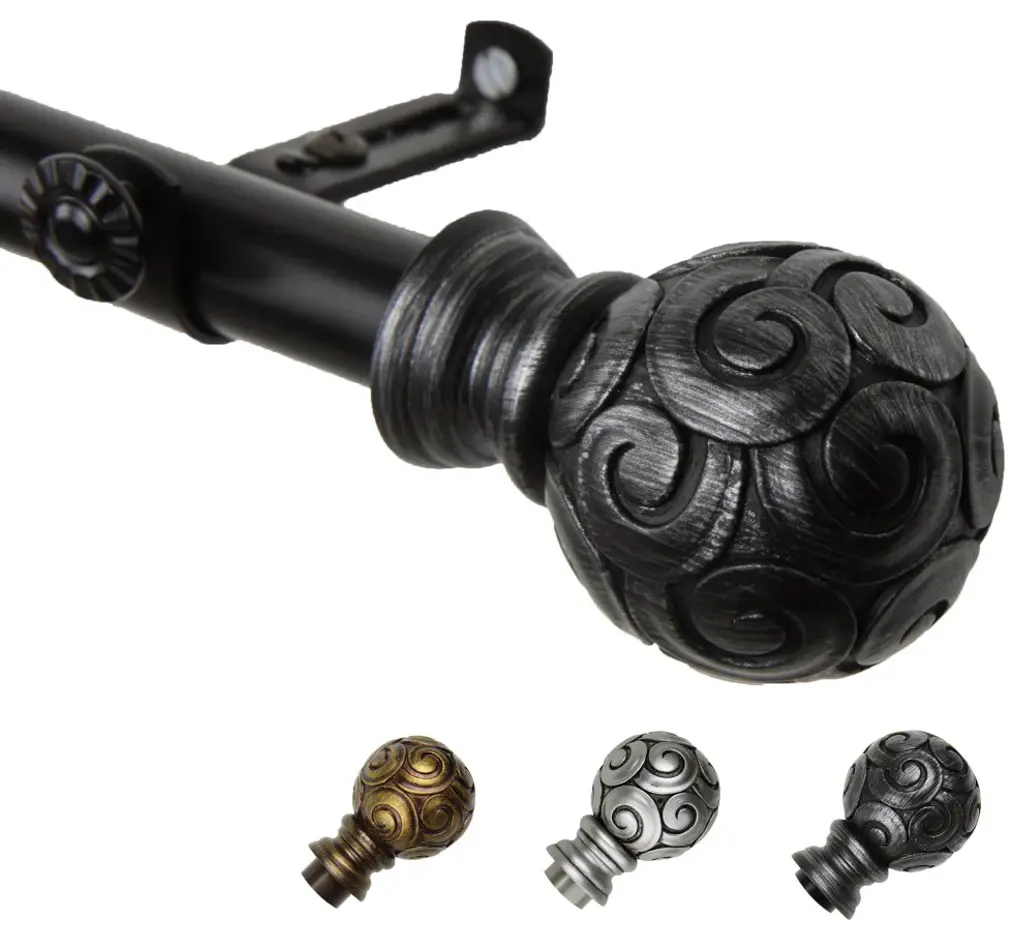 Introduce an elegant touch to your window treatment with this beautiful 13/16" diameter curtain rod set, made of high quality steel rods. Includes telescoping steel pole, mounting hardware, brackets, and 2 finials Projection: 2.875" Finial measurement: 2.5" W x 1.75" H x 1.75" D
