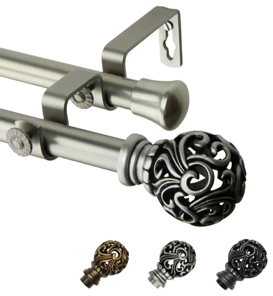 Introduce an elegant touch to your window treatment with this beautiful 13/16" diameter double curtain rod set, made of high quality steel rods. Includes 2 telescoping steel pole, mounting hardware, brackets, and 2 finials Projection: 2.875" Finial measurement: 2.5" W x 1.75" H x 1.75" D