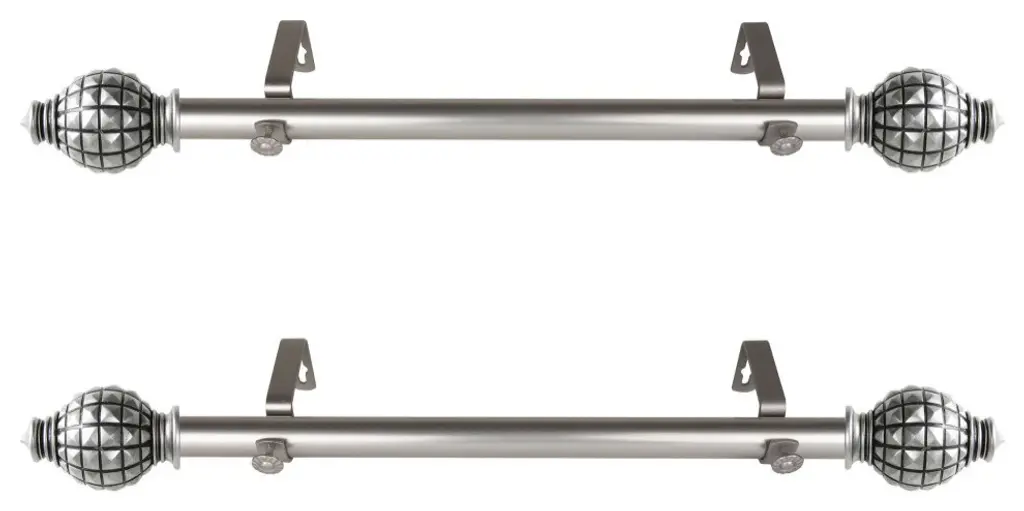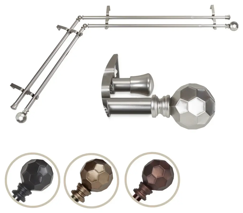 Central Design Products presents the perfect enhancement to your window treatment with high-end quality 4-Sided Double Bay Curtain Rods, Andre edition. Effortlessly style your 4 sided window treatment with these Bay Curtain Rods. Designed to add a modern touch for those tricky bay windows. Includes 8 curtain rods of 13/16" diameter, 8 support brackets, 6 corner connectors, and mounting hardware. Projection: 6.375" Clearance: 3.75" Rod Diameter: 13/16" Material: Steel Color: Satin Nickel