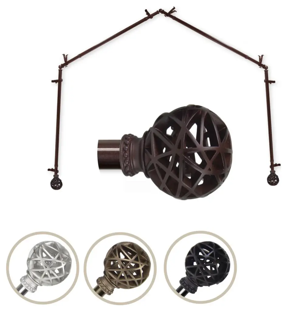 Add a sophisticated touch to your bay window treatment with a 13/16" diameter 4 part bay window curtain rod set. Made of high quality steel rods and resin finials. Includes four 28-48 inches rod; 8 brackets; 2 finials.Projection: 2.875 inchesFinial measurement: 3.75" W x 3" H x 3" DRod Diameter: 13/16 inch