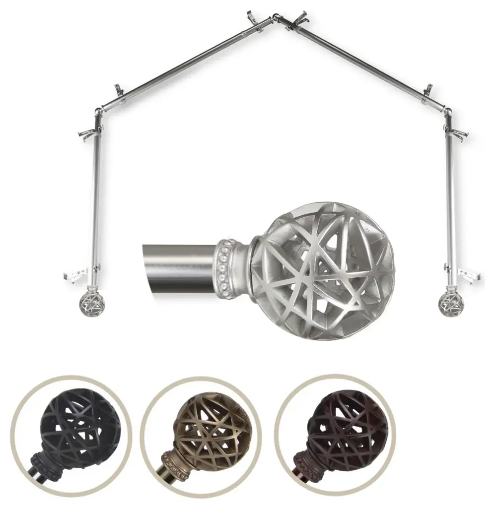 Add a sophisticated touch to your bay window treatment with a 13/16" diameter 4 part bay window curtain rod set. Made of high quality steel rods and resin finials. Includes four 28-48 inches rod; 8 brackets; 2 finials.Projection: 2.875 inchesFinial measurement: 3.75" W x 3" H x 3" DRod Diameter: 13/16 inch