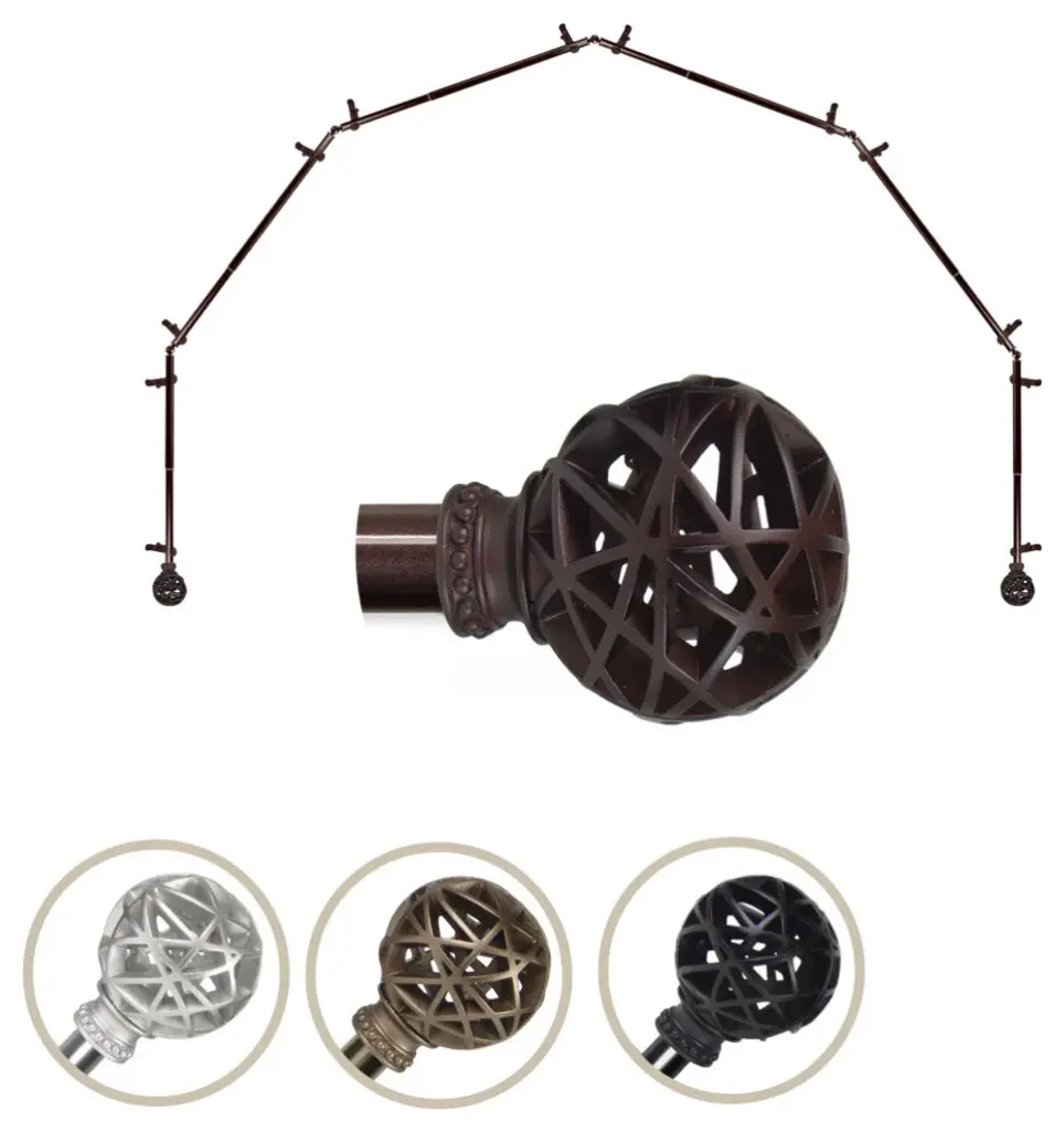 Add a sophisticated touch to your bay window treatment with a 13/16" diameter 6 part bay window curtain rod set. Made of high quality steel rods and resin finials. Includes six 28-48 inches rod; 12 brackets; 2 finials.Projection: 2.875 inchesFinial measurement: 3.75" W x 3" H x 3" DRod Diameter: 13/16 inch
