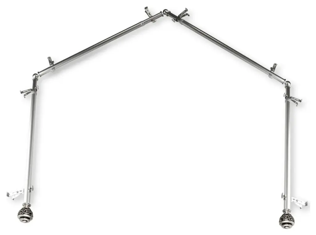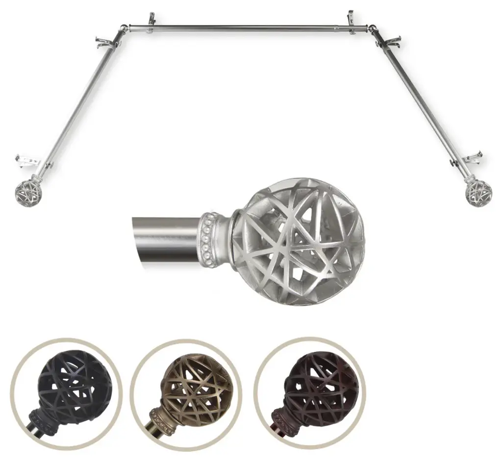 Add a sophisticated touch to your bay window treatment with a 13/16" diameter bay window curtain rod set. Made of high quality steel rods and resin finials. Includes one center rod 38-72 inches; two side rod 20-36 inches each; 6 brackets; 2 finials.Projection: 2.875"Finial measurement: 3.75" W x 3" H x 3" DRod Diameter: 13/16 inch