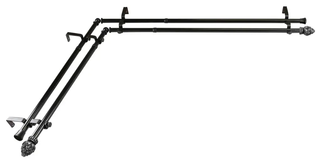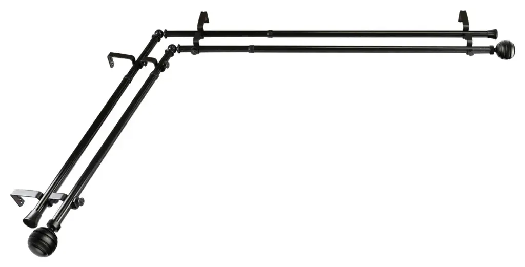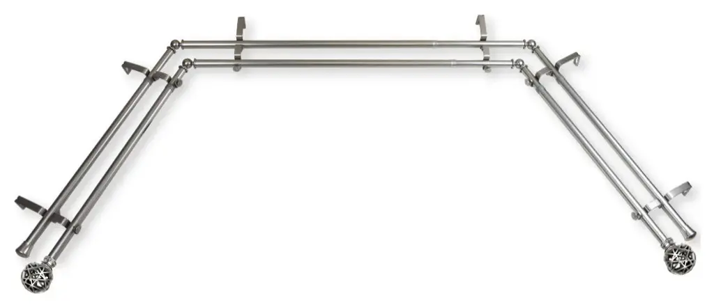 Add a sophisticated touch to your bay window treatment with a 13/16" diameter bay window curtain rod set. Made of high quality steel rods and resin finials. Includes two center rod 38-72 inches; four side rod 20-36 inches each; 6 brackets; 2 finials.Projection: front rod to wall 6.375"; back rod to wall 3.75"Finial measurement: 3.75" W x 3" H x 3" DRod Diameter: 13/16 inch