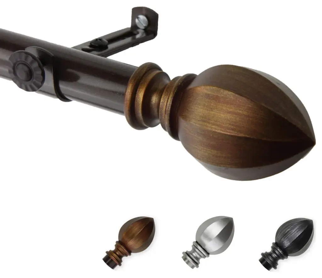 Introduce an elegant touch to your window treatment with this beautiful 13/16" diameter curtain rod set, made of high quality steel rods. Includes telescoping steel pole, mounting hardware, brackets, and 2 finials Projection: 2.875" Finial measurement: 3" W x 2.5" H x 2.5" D