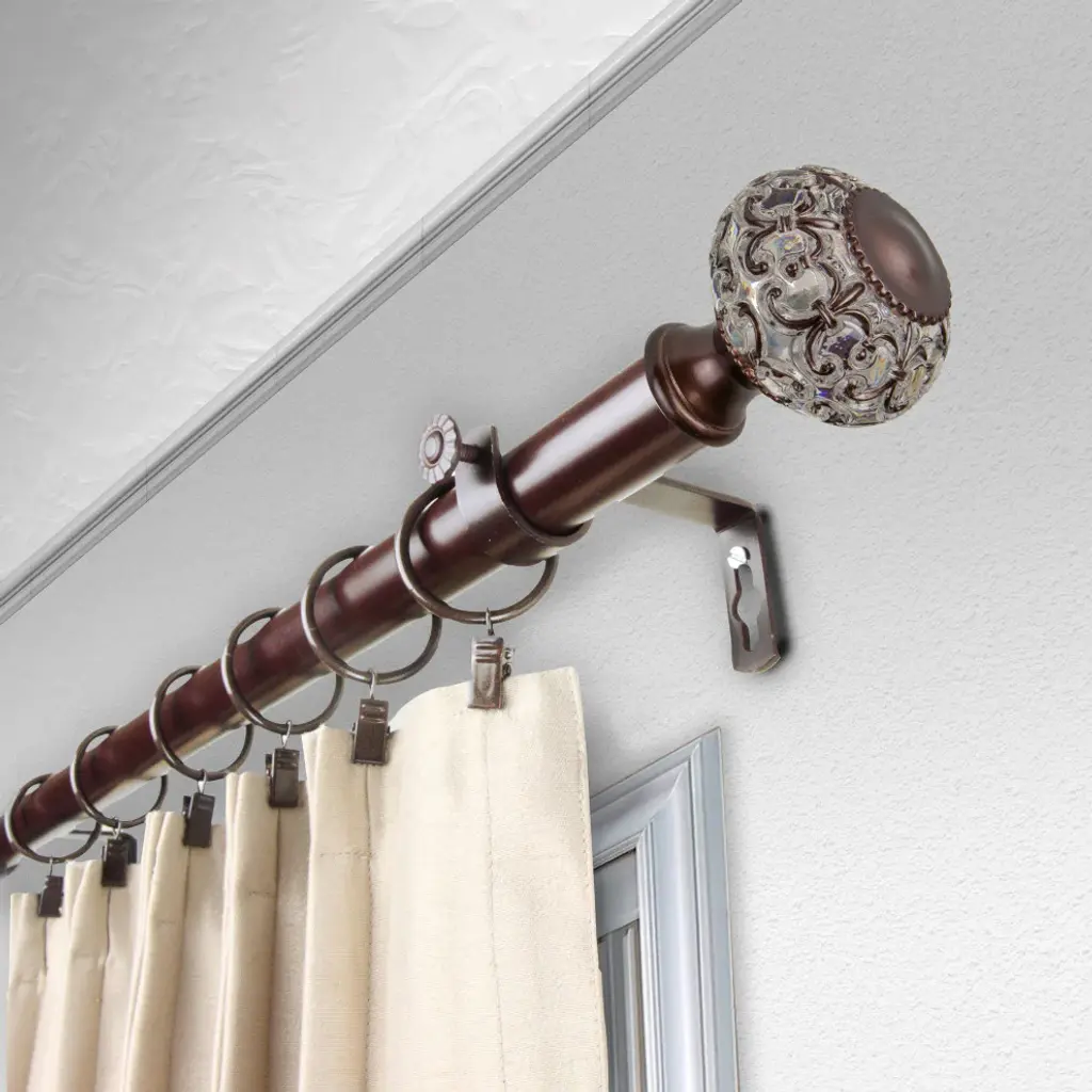 Decorate your window with Central Design Products Curtain Rod.This rod is made of solid steel pole with high quality finials that will add sophisticated touch to your windowIncludes one 28-48 inches telescoping steel pole, 2 brackets, and 2 finialsFinial Measurement: 3-1/4" W x 2-3/4" H x 3" DProjection: 3.625 inchesRod Diameter: 1 inch